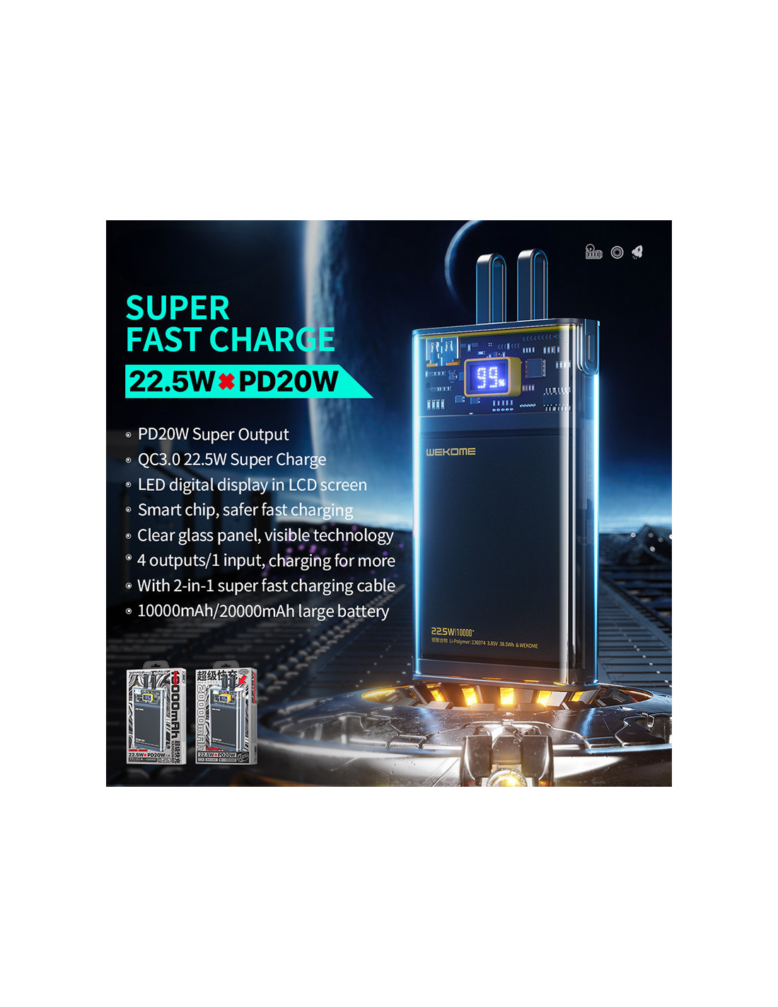 Powerbank 20000 mAh Super Charging Z Wbudowanym Kablem USB-C & Lightning PD 20 W + QC 22.5W Wekome Wp-325 Vanguard Series Czarny