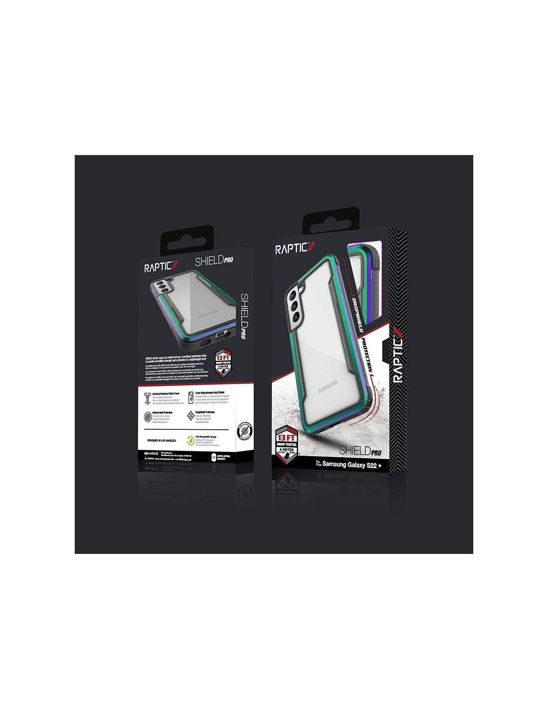Aluminiowa obudowa ochronna Raptic Shield Pro do Samsunga Galaxy S22+ 5G. Hybrydowa konstrukcja z anodyzowanego aluminium oraz przezroczystego polikarbonu oferuje podwyższony stopień ochrony podczas upadków z wysokości nawet 4 metrów (13 FT DROP TESTED). Wewnętrzną część obudowy wraz z przyciskami bocznymi wykonano z termoplastycznego materiału TPU, tak aby telefon nie miał bezpośrednio kontaktu z metalową ramką etui. Specjalny bąbelkowy wzór absorbuje i rozprasza dodatkowo siłę uderzenia podczas upadku na twarde podłoże.