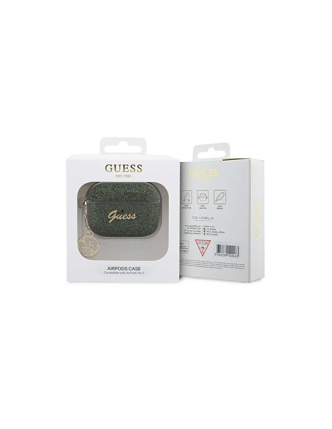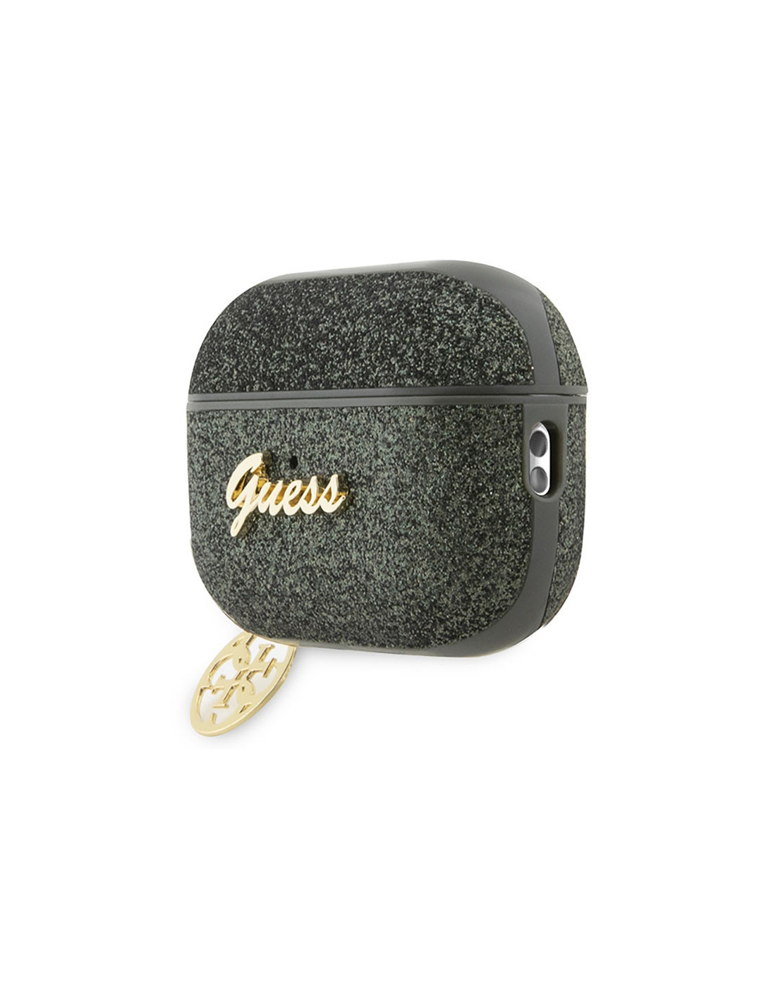 Ekskluzywne etui do słuchawek AirPods jest wszystkim czego potrzebujesz, aby prezentować się stylowo i modnie. Kolekcja wyróżnia się warstwą mieniącego się brokatu oraz metalowym złotym logo Guess w stylu vintage. Dodatkowo wyposażone jest w odpinaną, ozdobną zawieszkę zakończoną charmsem z logo Guess 4G.