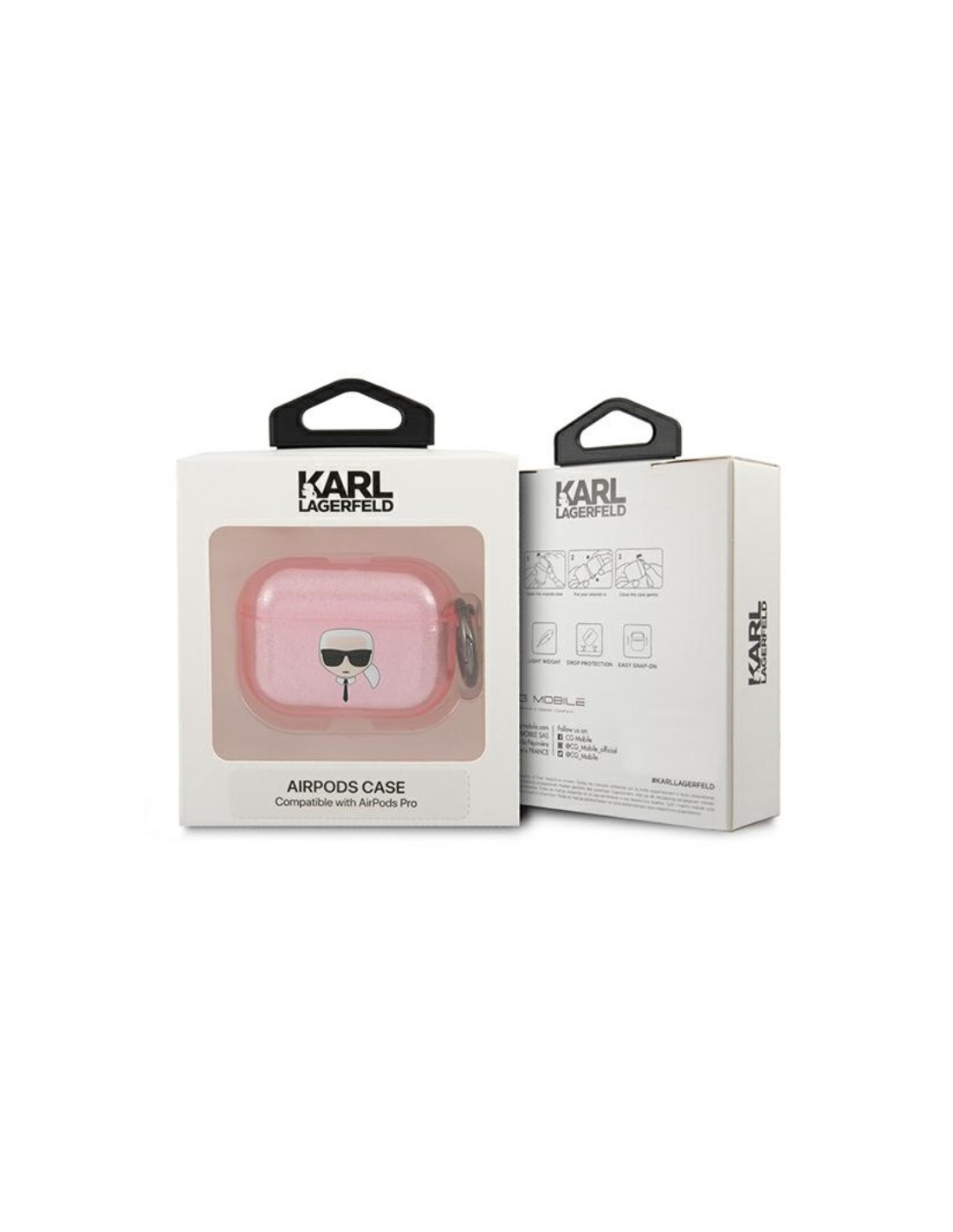 Karl Lagerfeld Head Glitter to etui słuchawek Airpods Pro z grafiką przedstawiającą projektanta.