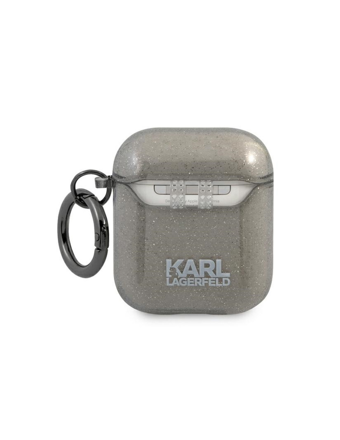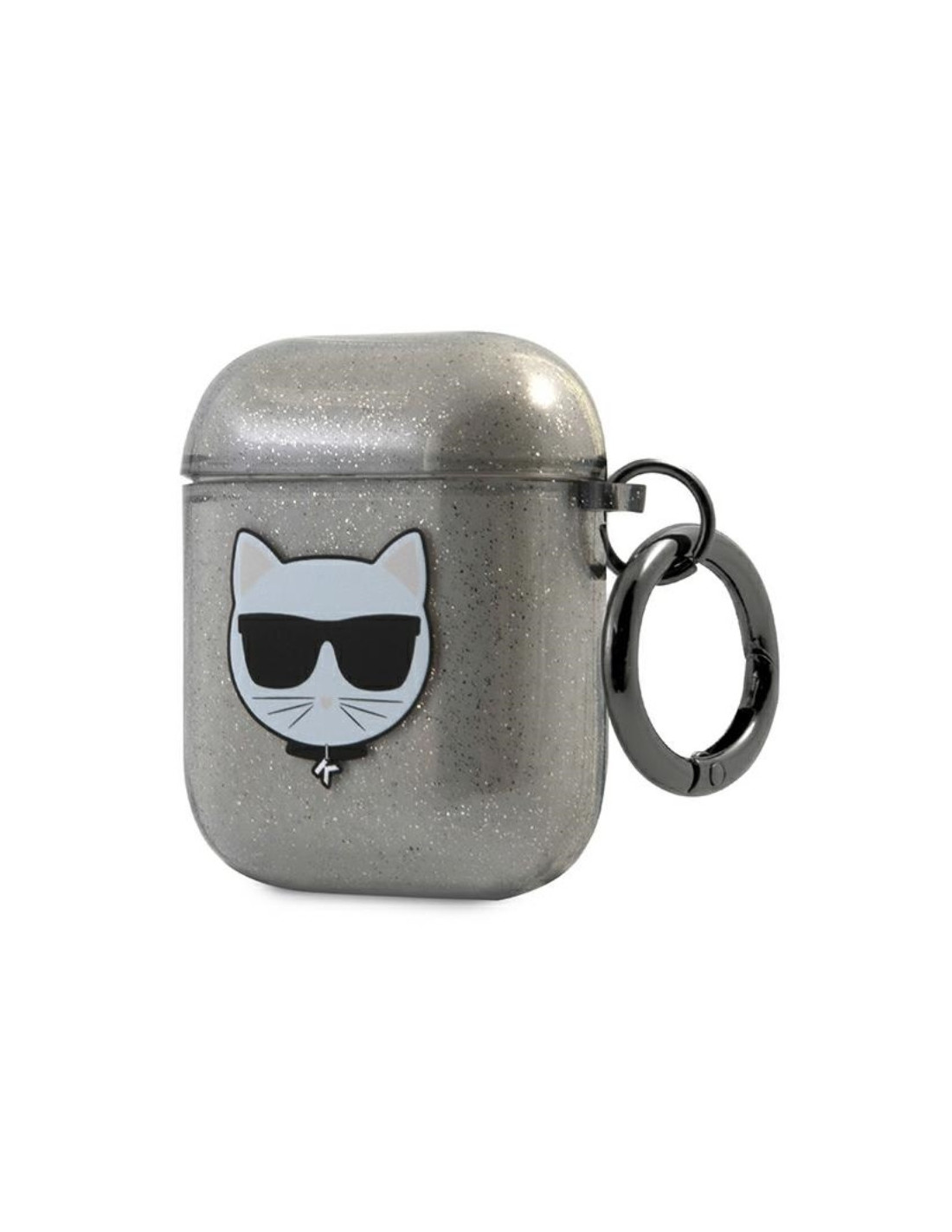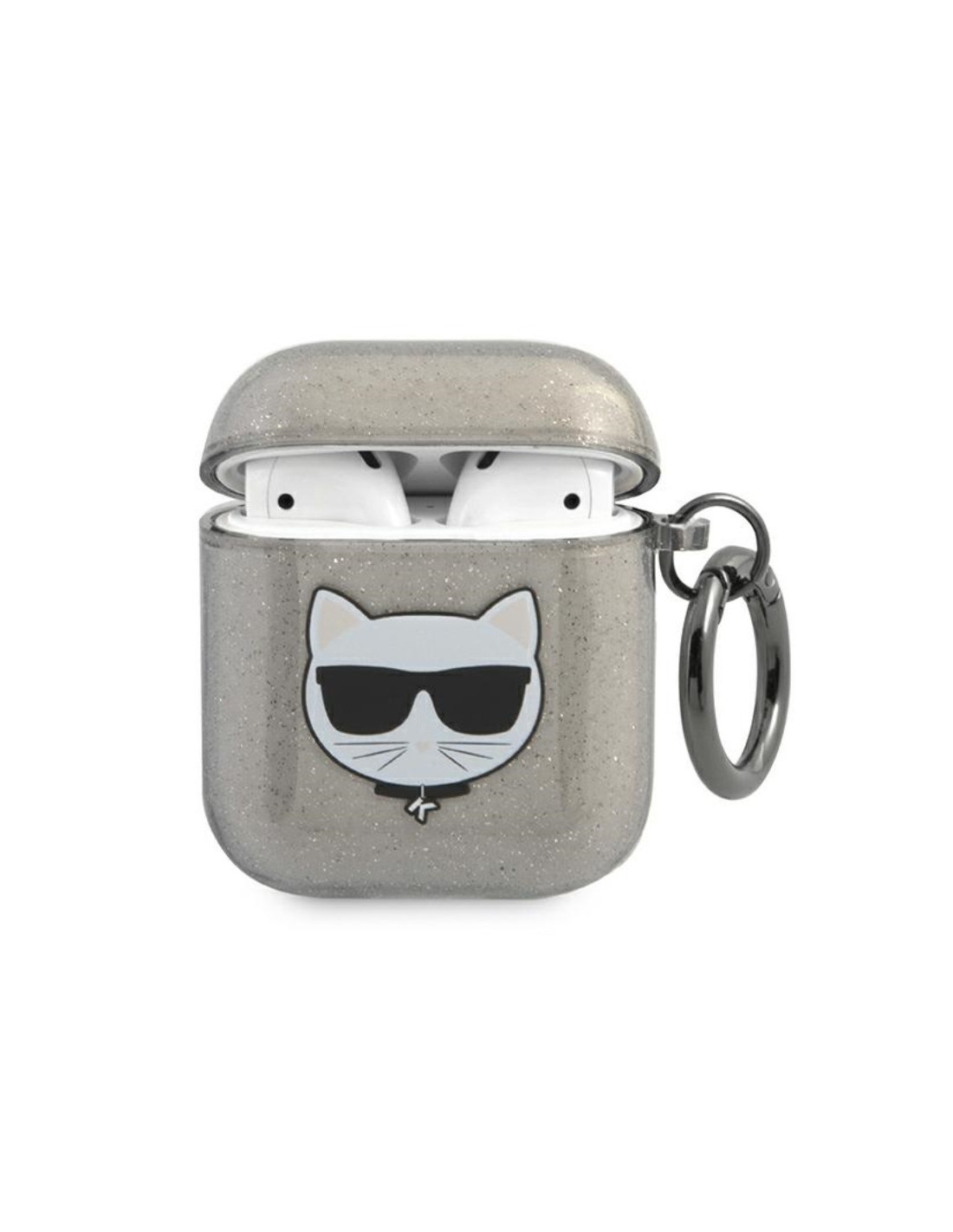 Karl Lagerfeld Choupette Head Glitter to etui słuchawek Airpods 1&2 gen z grafiką przedstawiającą kotkę Choupette.