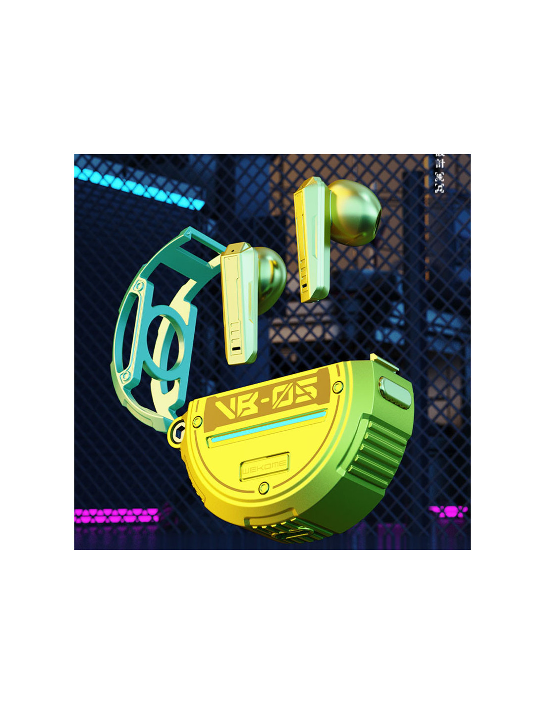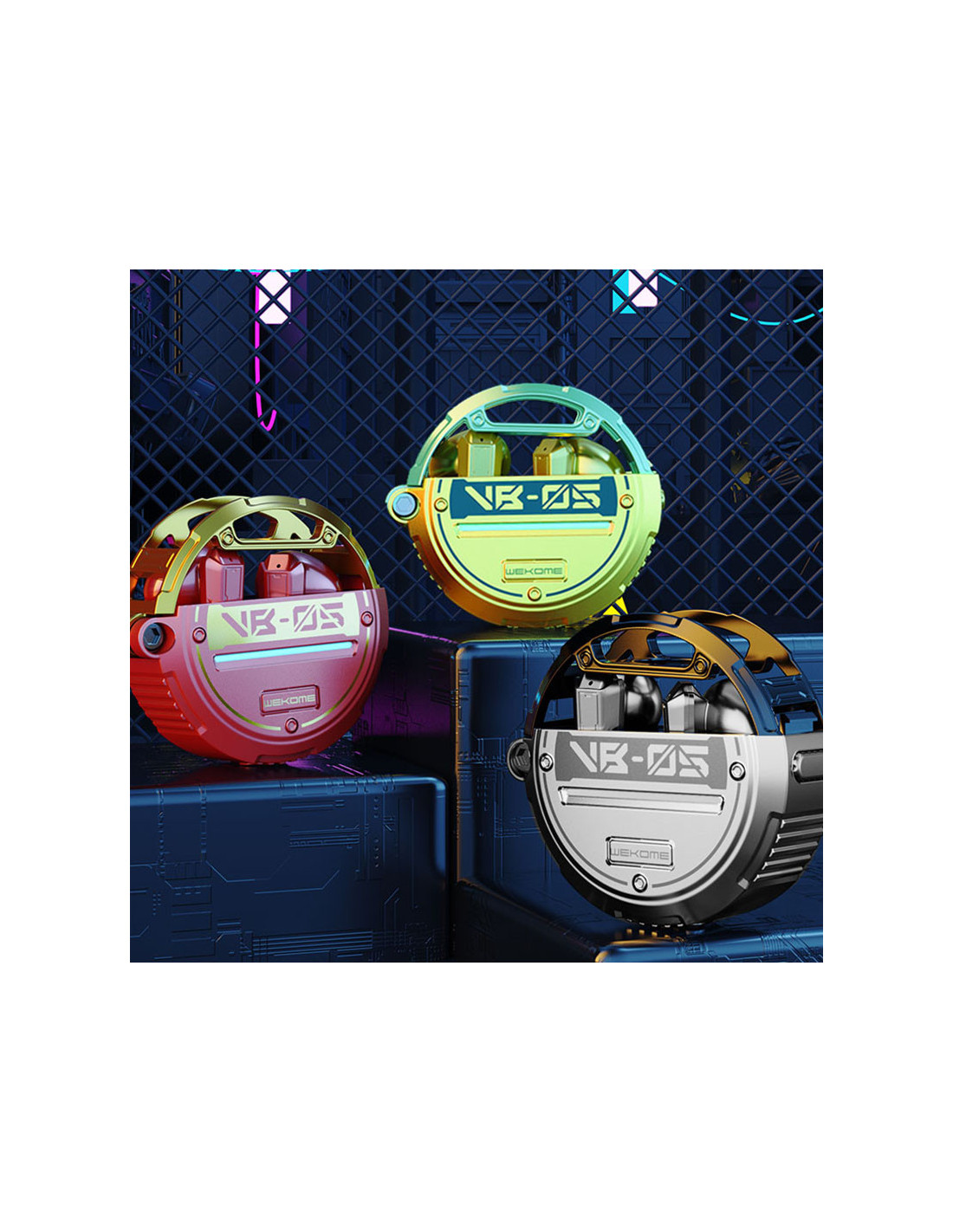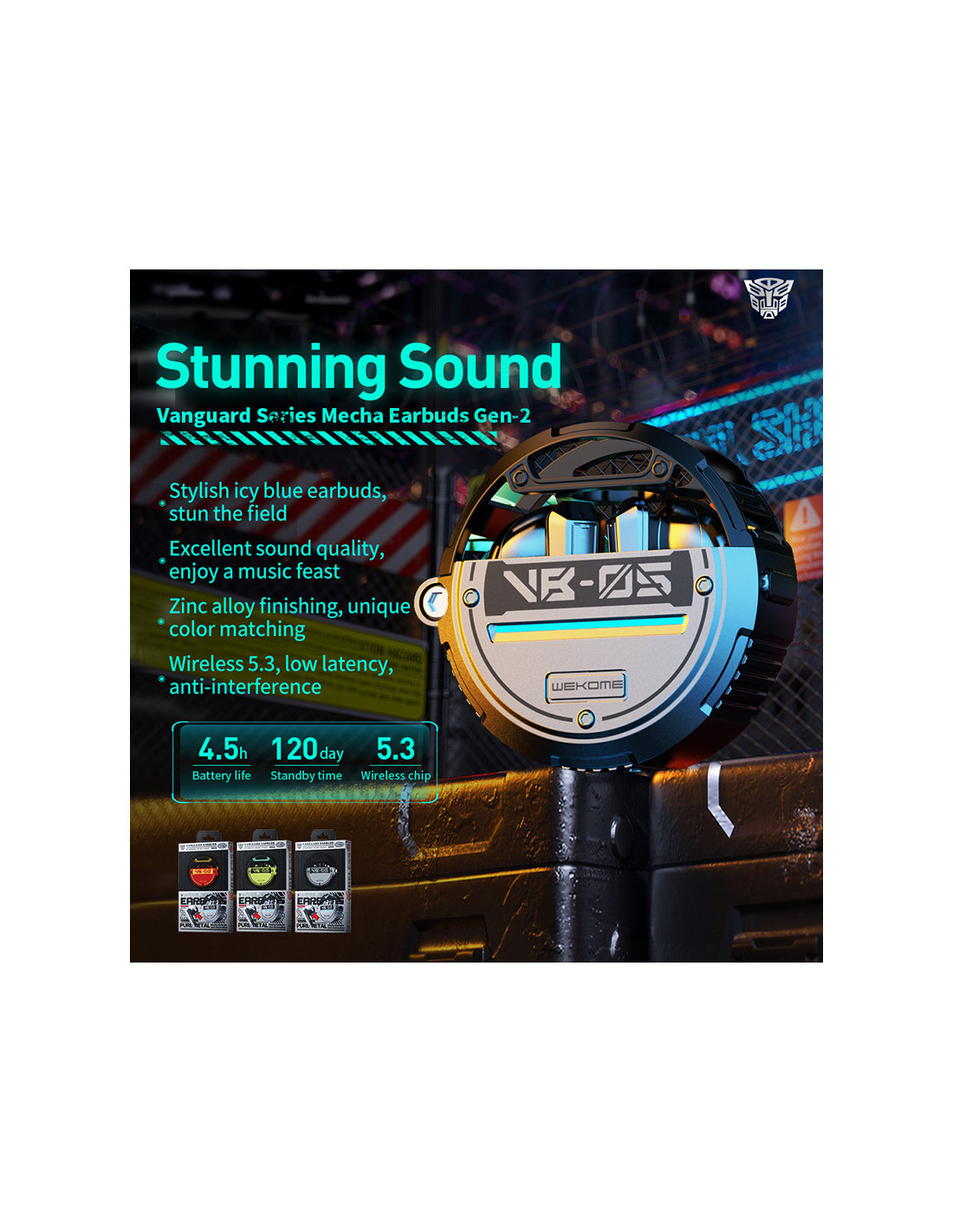 Bezprzewodowe słuchawki dokanałowe WEKOME VB05 True Wireless z podświetlanym etui ładującym Mecha. Słuchawki wykorzystują nową wersję technologii bezprzewodowej Bluetooth 5.3, która zmniejsza opóźnienia, zakłócenia i poprawia żywotność baterii. Druga generacja słuchawek VB05 Vanguard Series oferuje tym samym jeszcze lepszy dźwięk oraz czas odtwarzania muzyki do 4,5 godziny na jednym ładowaniu.