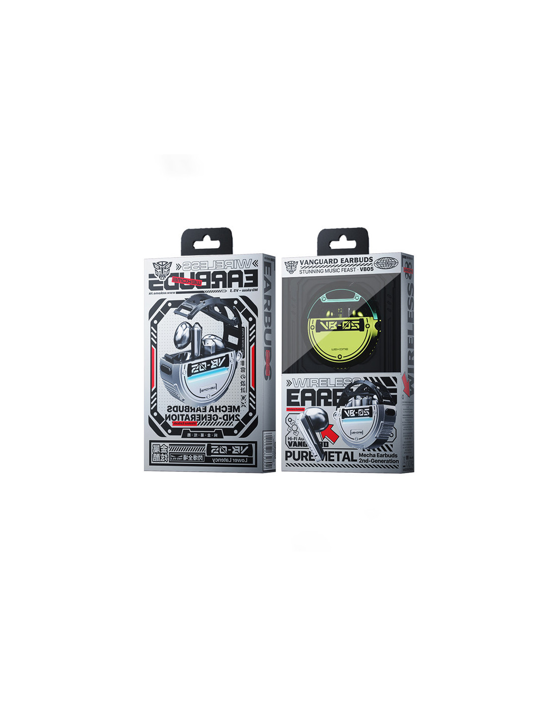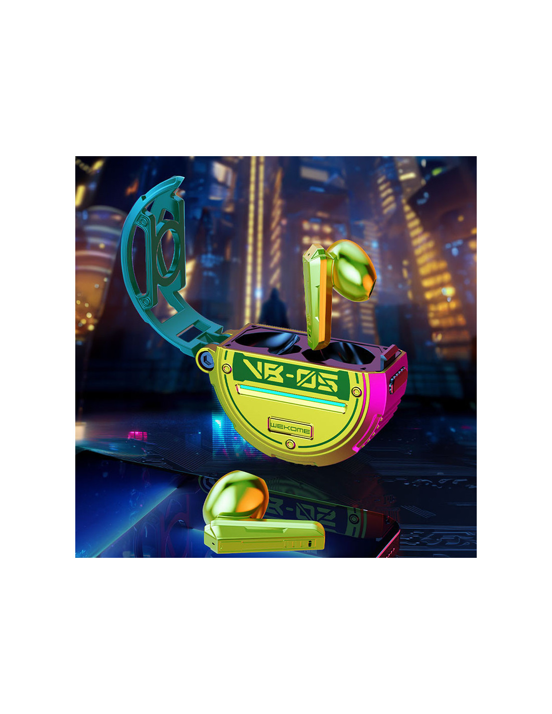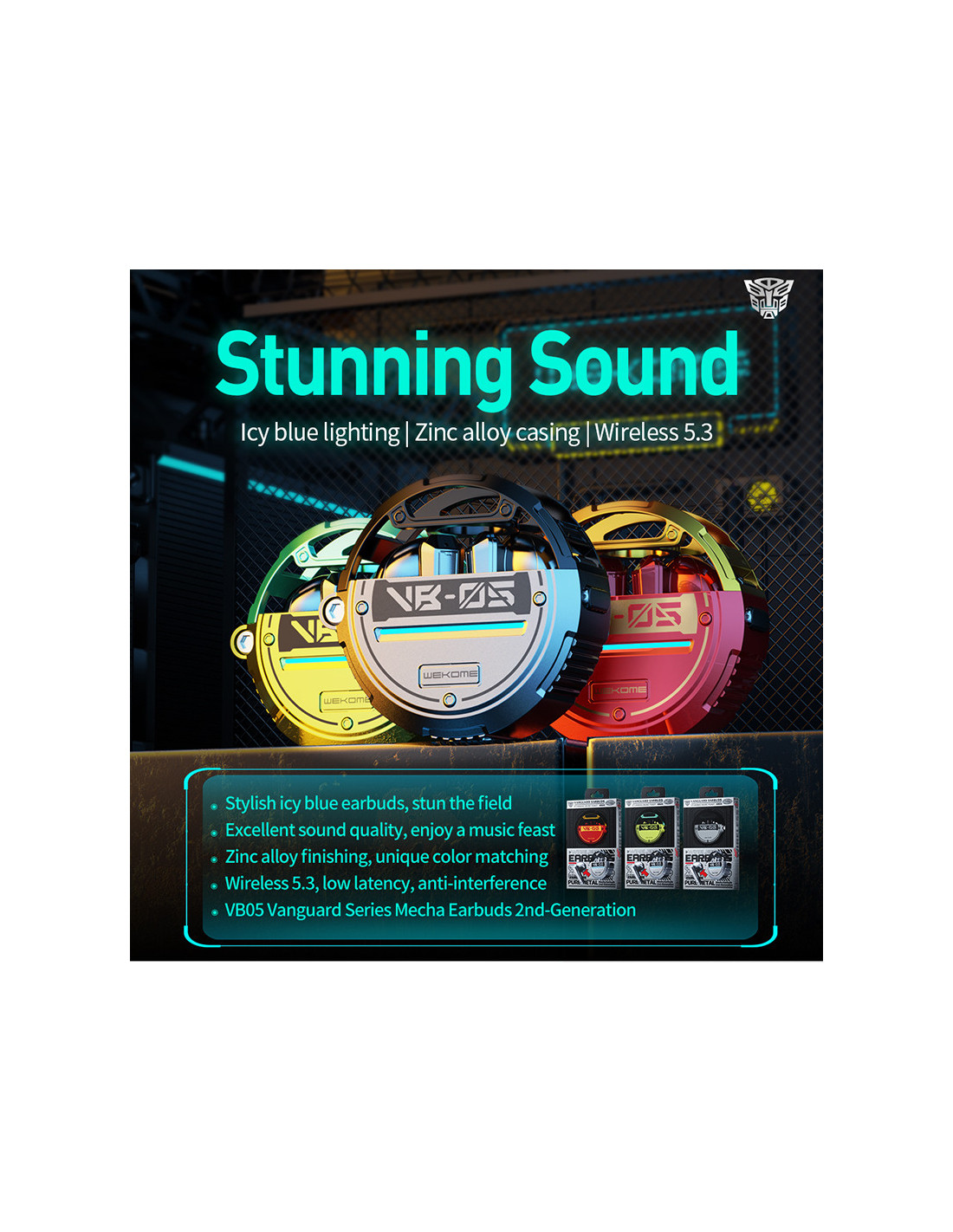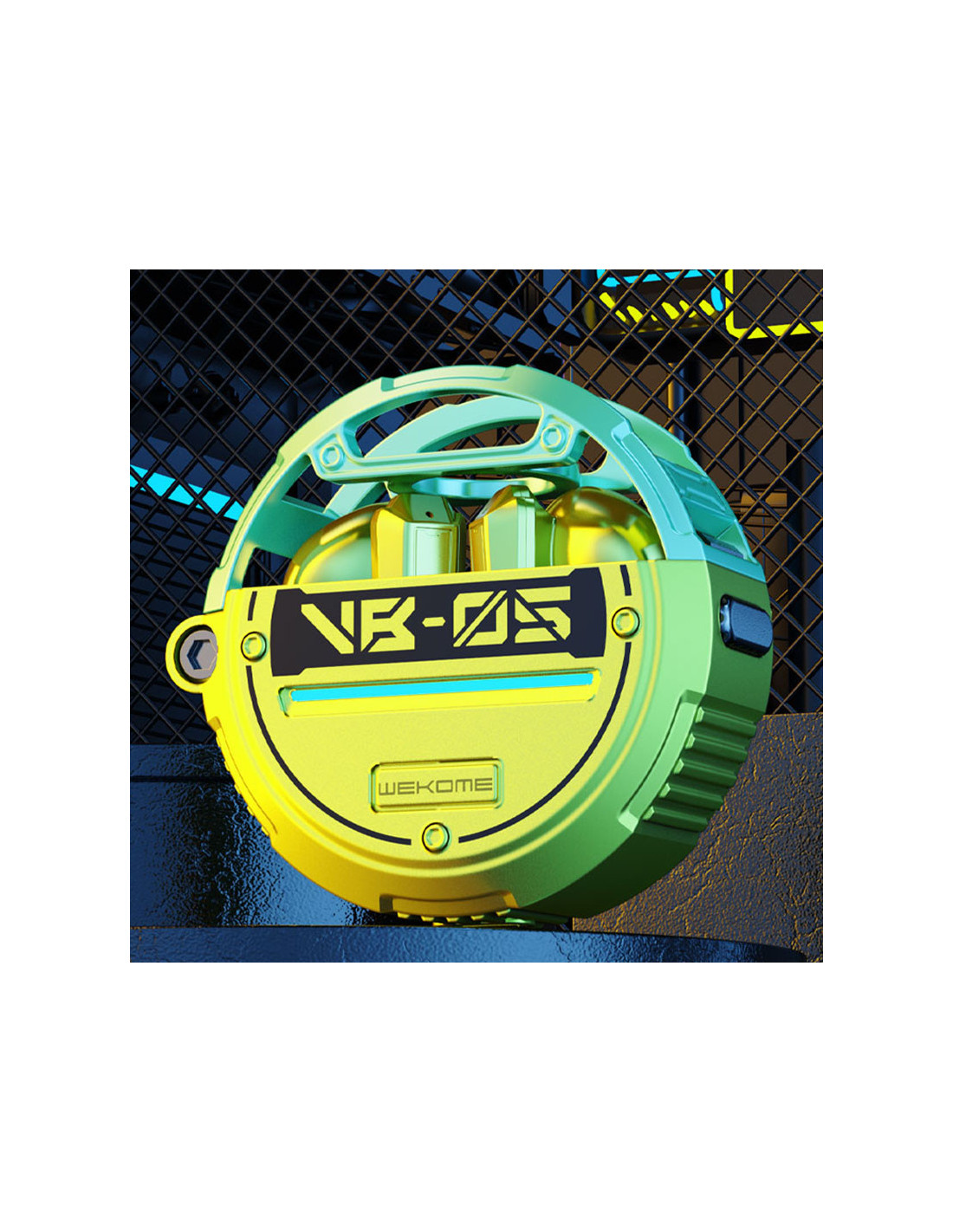 Bezprzewodowe słuchawki dokanałowe WEKOME VB05 True Wireless z podświetlanym etui ładującym Mecha. Słuchawki wykorzystują nową wersję technologii bezprzewodowej Bluetooth 5.3, która zmniejsza opóźnienia, zakłócenia i poprawia żywotność baterii. Druga generacja słuchawek VB05 Vanguard Series oferuje tym samym jeszcze lepszy dźwięk oraz czas odtwarzania muzyki do 4,5 godziny na jednym ładowaniu.