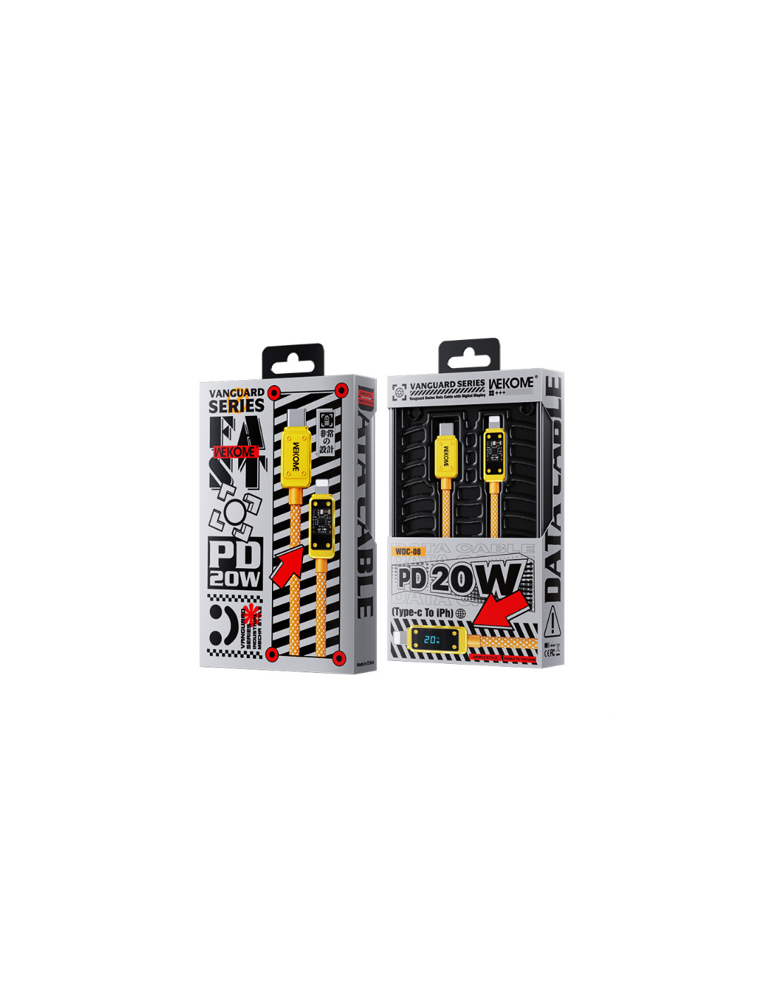 Kabel WEKOME WDC-08 Vanguard Series do ładowania i transmisji danych o długości 100 cm, wyposażony w złącze USB-C na Lightning.