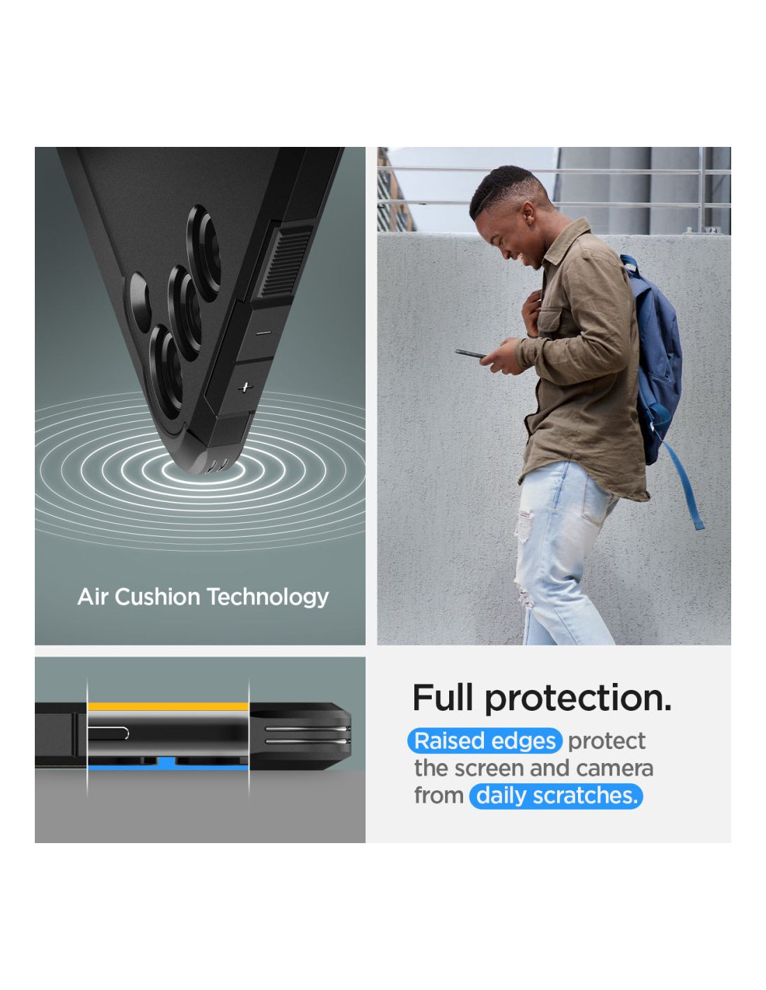 Nieco podniesiona forma obudowy wokół aparatu i ekranu chroni go przed zarysowaniami, unosząc telefon tuż nad powierzchnią płaską. Posiada osłony na przyciski i wycięcia na porty.