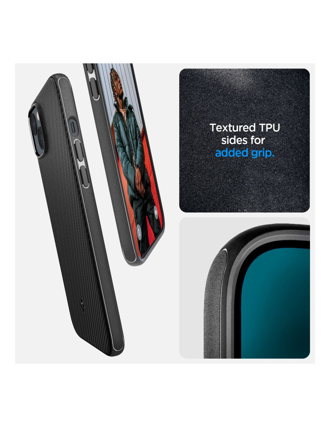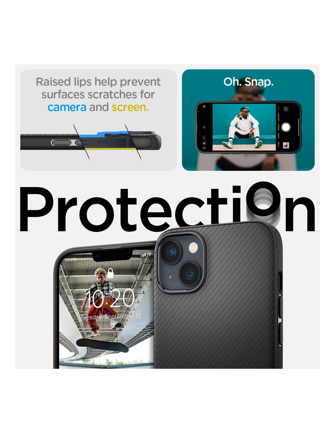 Nieco podniesiona forma obudowy wokół aparatu i ekranu chroni go przed zarysowaniami, unosząc telefon tuż nad powierzchnią płaską.
