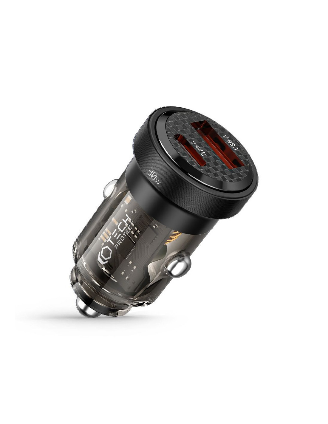 Tech-Protect CC30W to dwuportowa ładowarka samochodowa wyposażona w gniazda o łącznej mocy 30W. Jeden z portów to typowy USB-A w standardzie szybkiego ładowania QuickCharge 3.0, drugi natomiast to USB Type-C z zaimplementowaną technologią PowerDelivery.