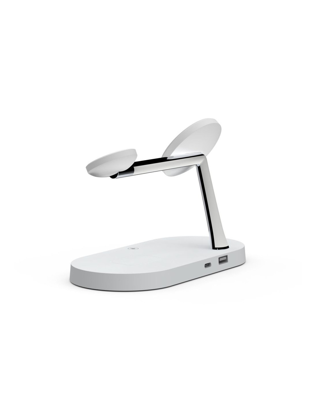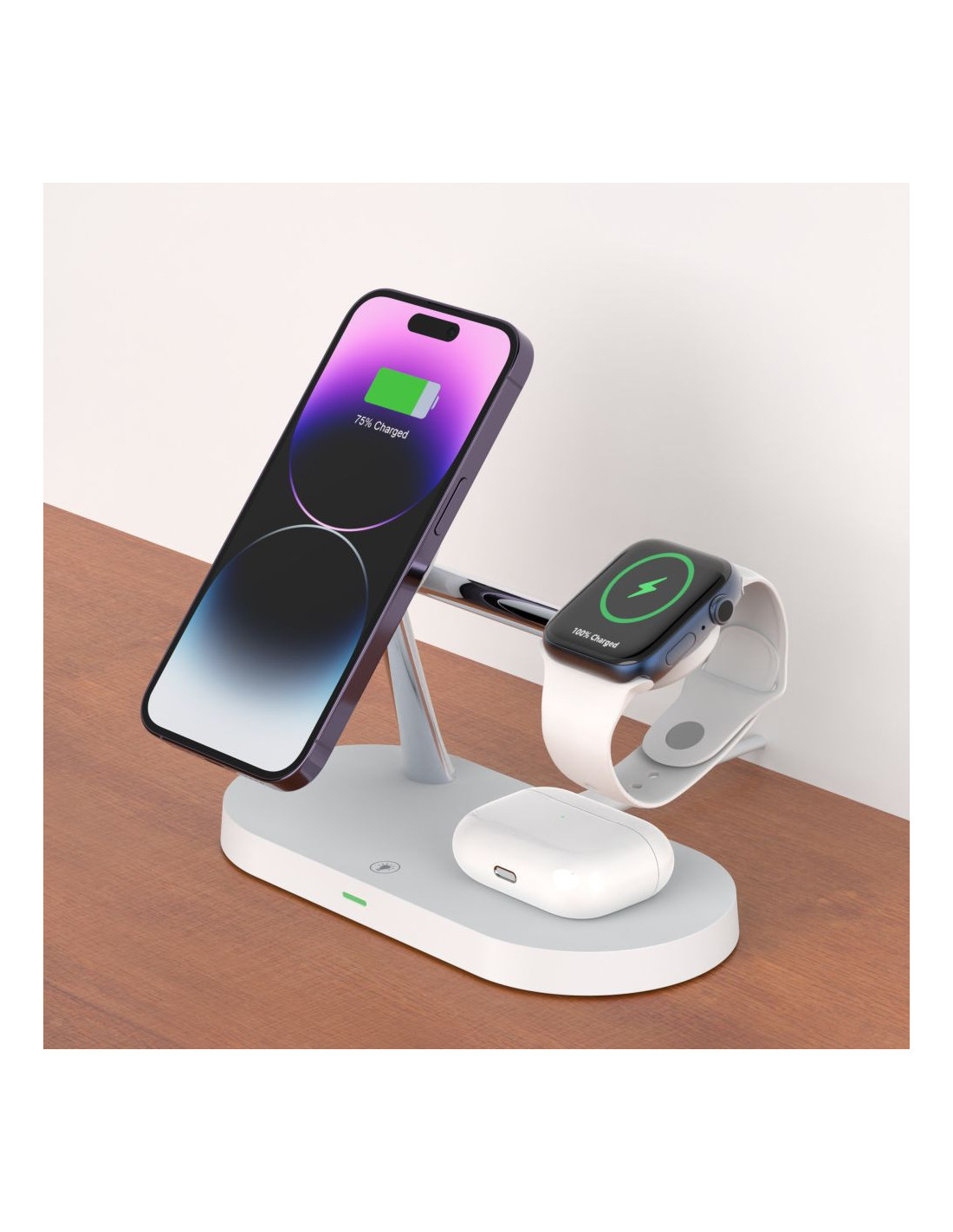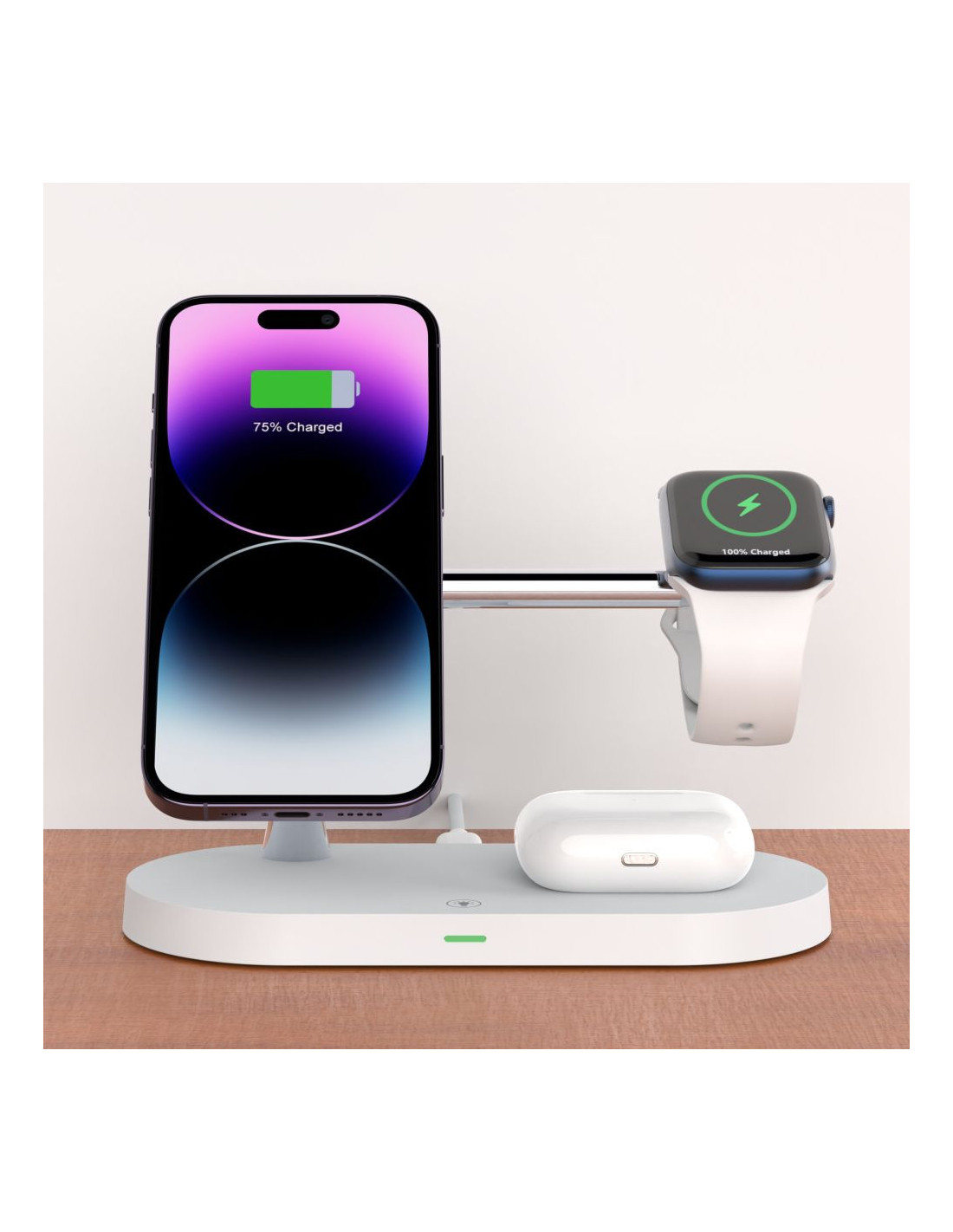 Wielofunkcyjna ładowarka indukcyjna firmy Tech-Protect, umożliwia ładowanie jednocześnie, bądź całkowicie odddzielnie, trzech urządzeń - iPhone’a z funkcją MagSafe, Airpodsy i Apple Watch'a. Prosty, acz funkcjonalny design wykończony w matowej powierzchni nadaje mu bardzo estetycznego wyglądu.