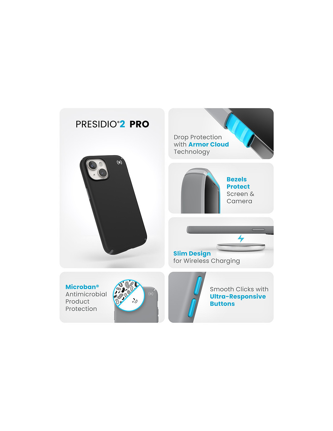 Ultra wytrzymałe etui do iPhone’a 15 / 14 / 13 z ochroną antybakteryjną firmy MICROBAN® - światowego lidera rozwiązań przeciwdrobnoustrojowych z szerokim portfolio ponad 25 zatwierdzonych technologii. Aktywny składnik wbudowany w strukturę etui Presidio2 Pro powstrzymuje 99% bakterii, które gromadzą się na jego powierzchni. Technologia MICROBAN® zapewnia w ten sposób dożywotnią ochronę przed bakteriami, które powodują odbarwiania oraz nieprzyjemny zapach.