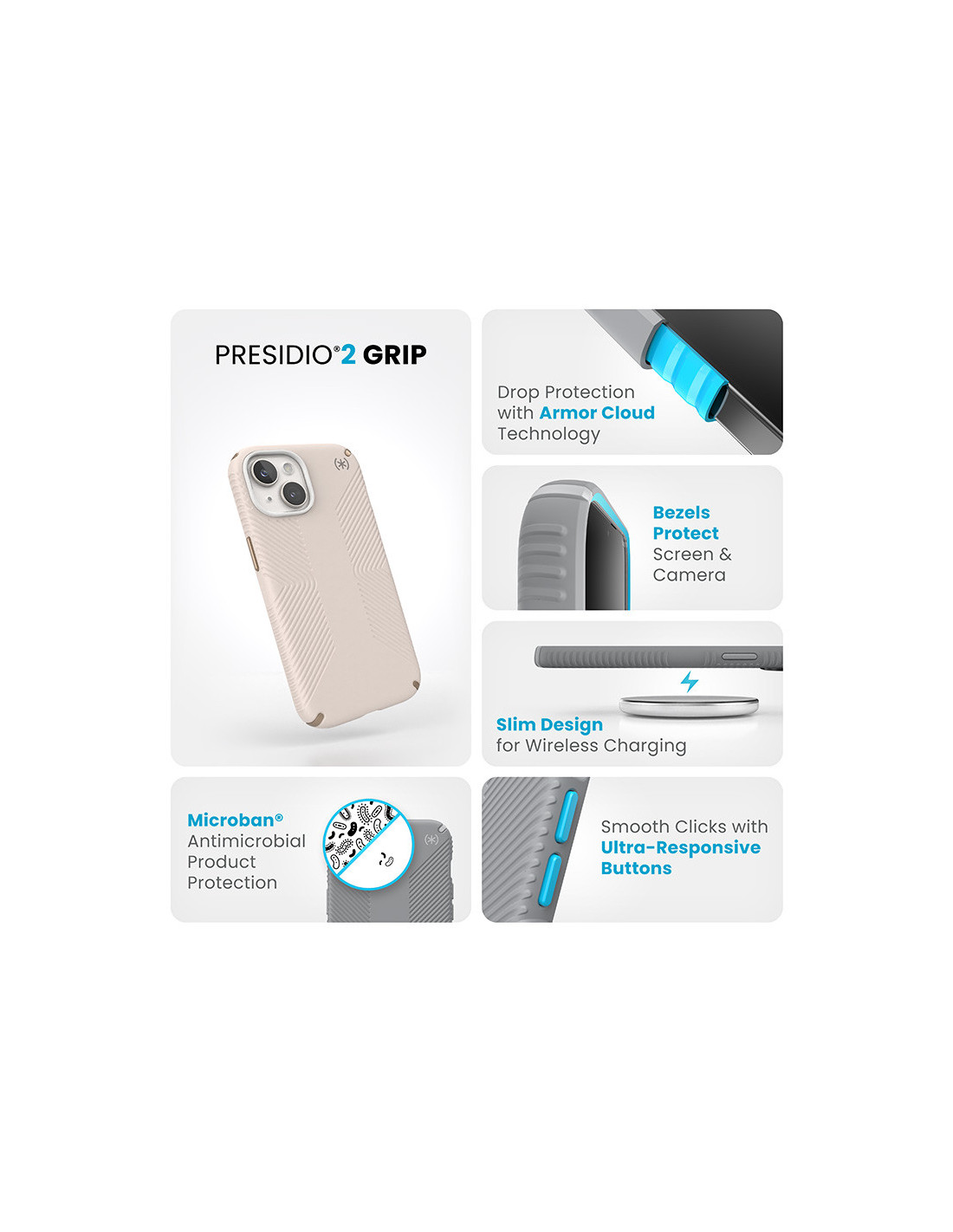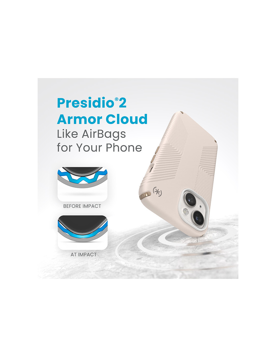 Etui Presidio2 Grip zostało ponadto wykonane w technologii Armor Cloud™, dzięki której obudowa Speck jest odporna na upadki z wysokości nawet 4 metrów. System mikrokapsułek wewnątrz ścianek etui działa na podobnej zasadzie, co poduszki powietrze stosowane w samochodach. W momencie upadku na twarde podłoże, kapsułki amortyzują siłę uderzenia przy pomocy skompresowanego w nich powietrza.
