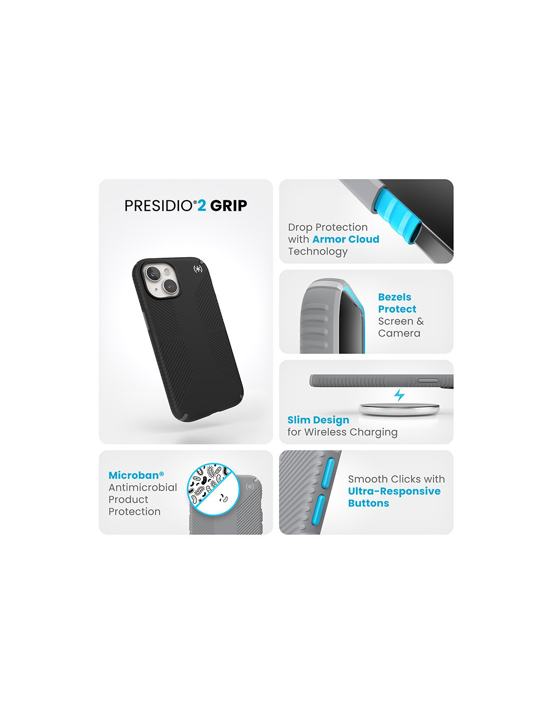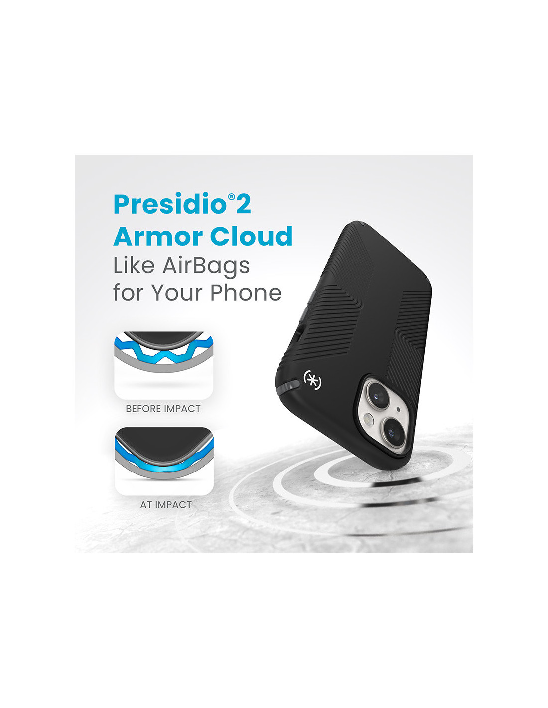 Etui Presidio2 Grip zostało ponadto wykonane w technologii Armor Cloud™, dzięki której obudowa Speck jest odporna na upadki z wysokości nawet 4 metrów. System mikrokapsułek wewnątrz ścianek etui działa na podobnej zasadzie, co poduszki powietrze stosowane w samochodach. W momencie upadku na twarde podłoże, kapsułki amortyzują siłę uderzenia przy pomocy skompresowanego w nich powietrza.