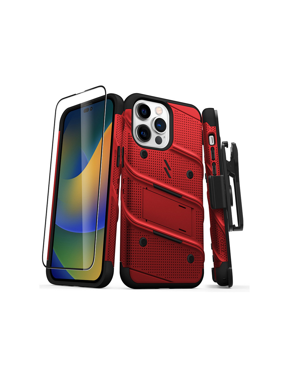 Etui Pancerne Do iPhone 14 Pro Max Ze Szkłem 9H Na Ekran + Uchwyt Z Podstawką Zizo Bolt Series Czerwony