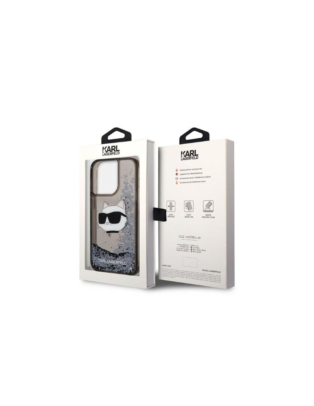 Aby nadać niesamowitego efektu, konstrukcja została ozdobiona podobizną kotki projektanta, sławnej Choupette, podkreśloną przez płynne, mieniące się w świetle drobinki brokatu, które zmieniają swoje ułożenie pod wpływem zmiany kąta nachylenia etui, tworząc efekt wodospadu.