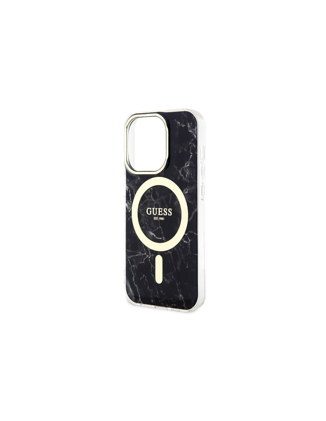 Cały przedni panel etui został ozdobiony wzorem surowego marmuru, co nadaje mu wyjątkowego uroku. Dodatkową ozdobą jest kultowe złote logo Guess, które podkreśla wyrafinowaną estetykę etui.