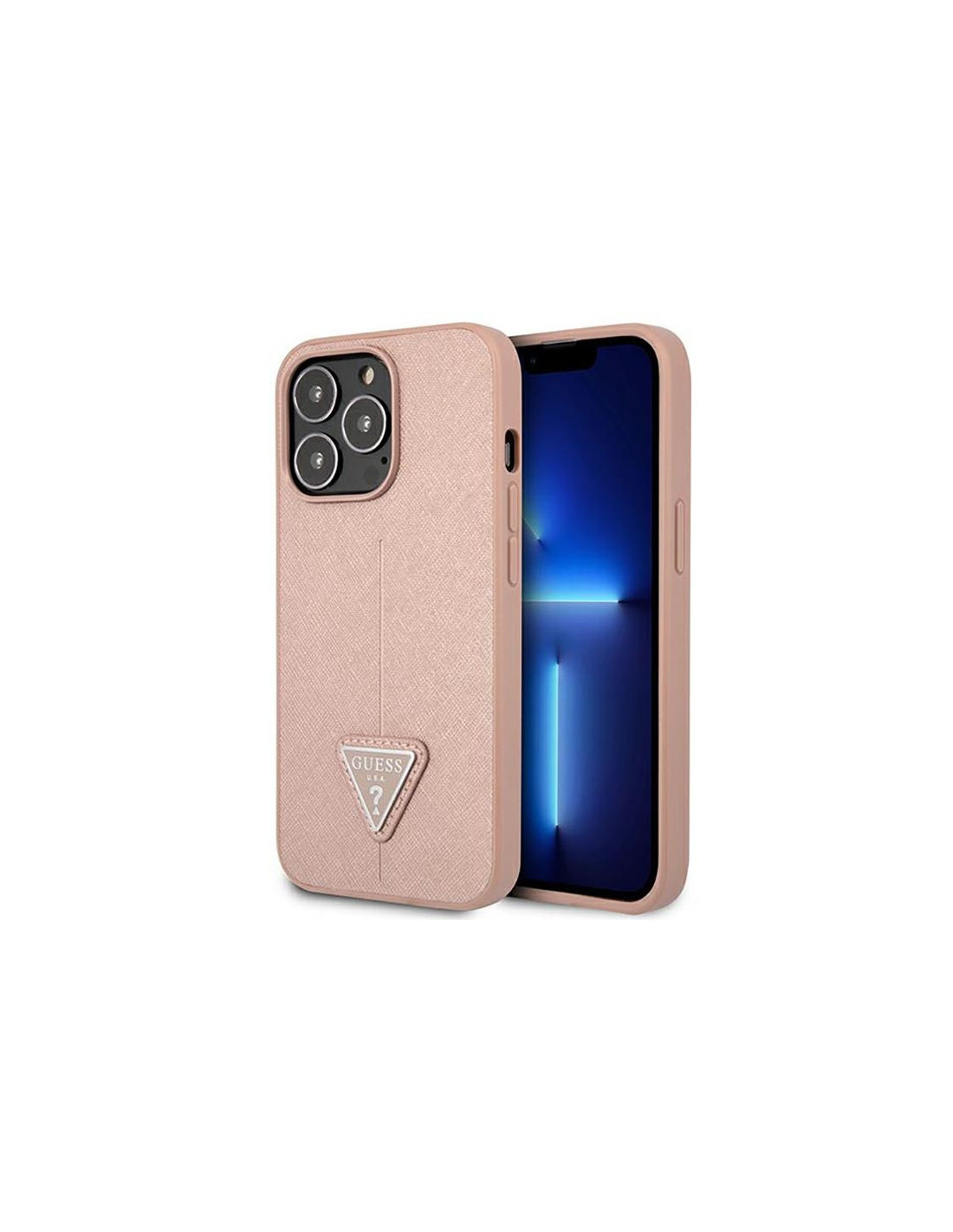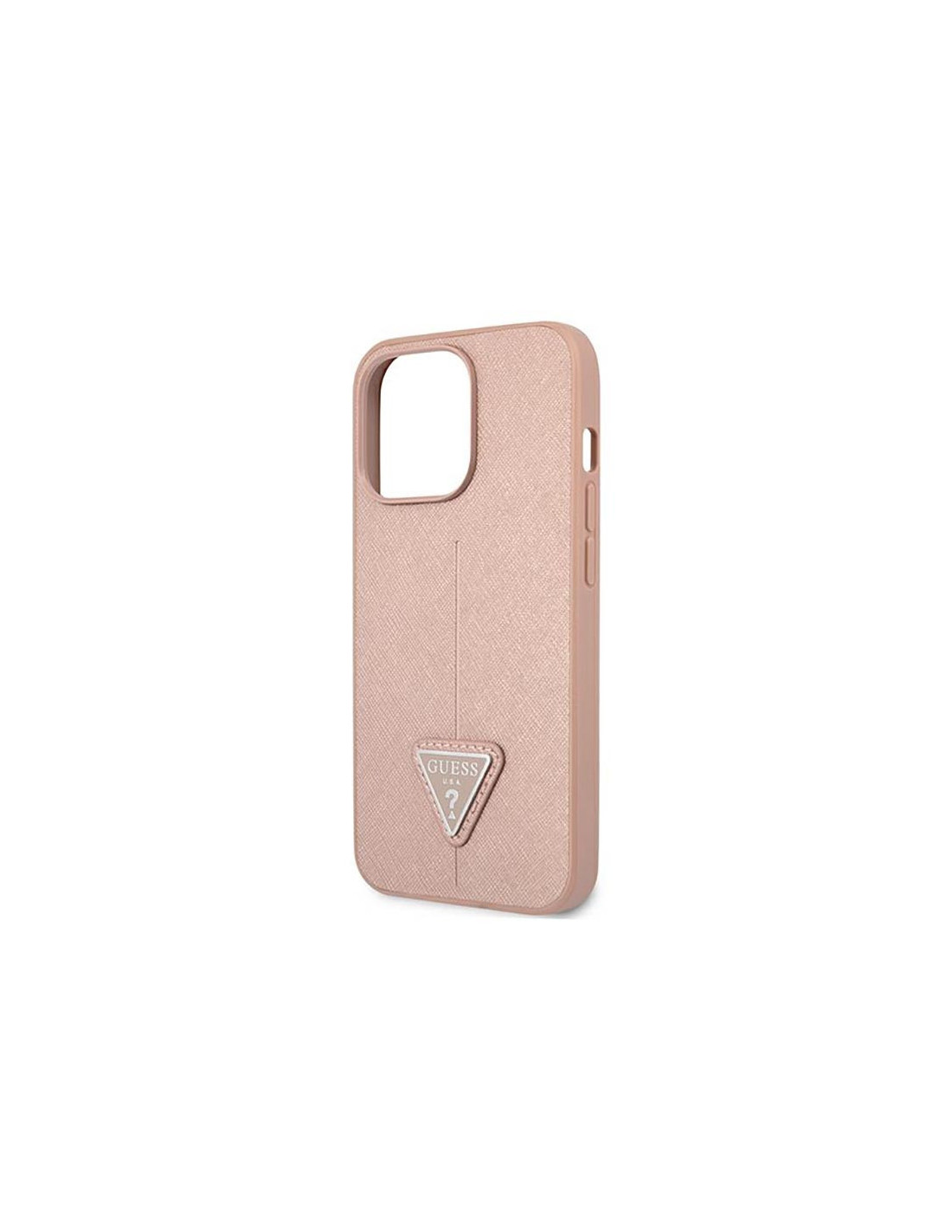 Guess Saffiano Triangle Logo etui wykonane z przyjemnej w dotyku fakturze ze skóry ekologicznej saffiano. Elegancki design podkreśla metalowe, trójkątne logo Guess.