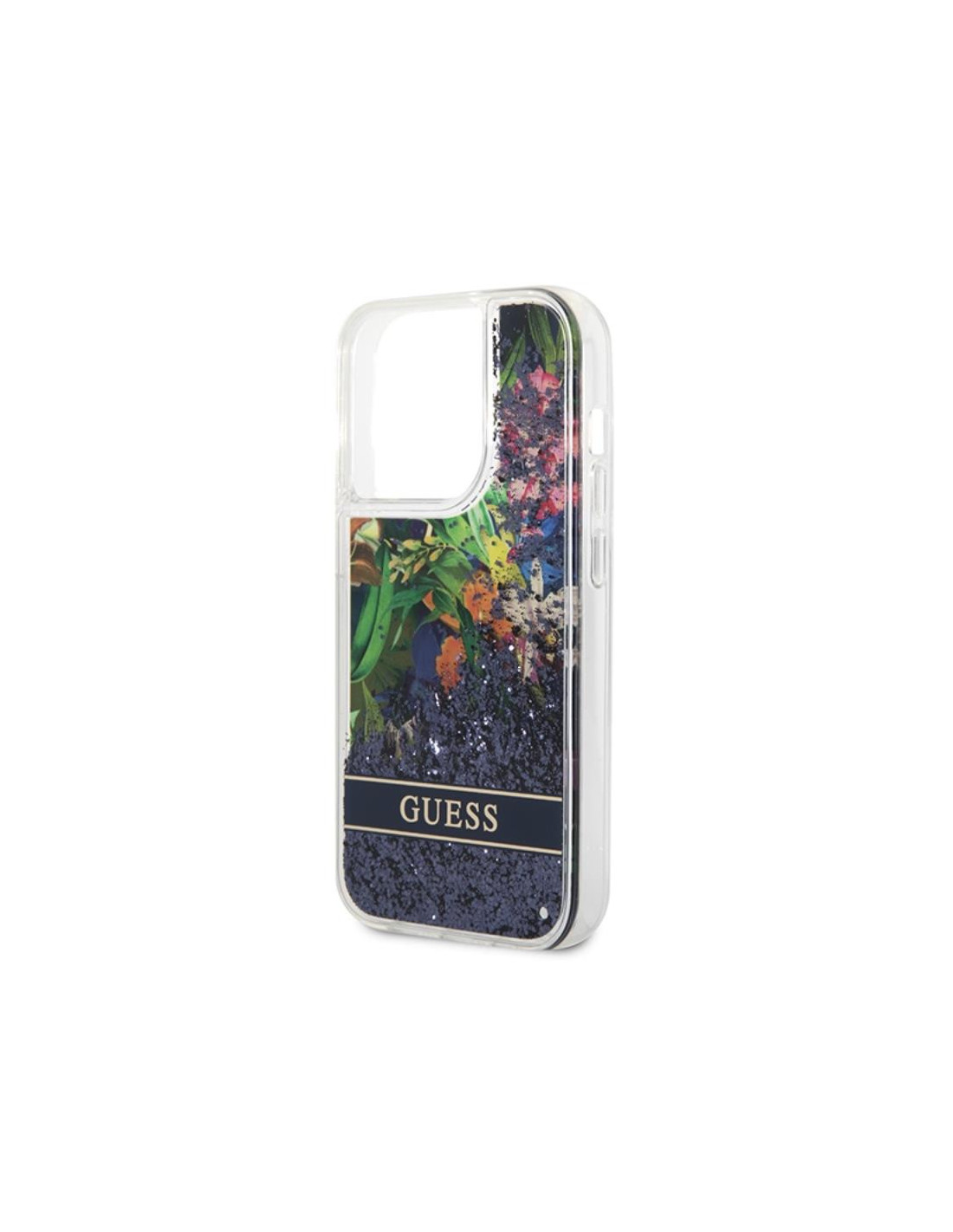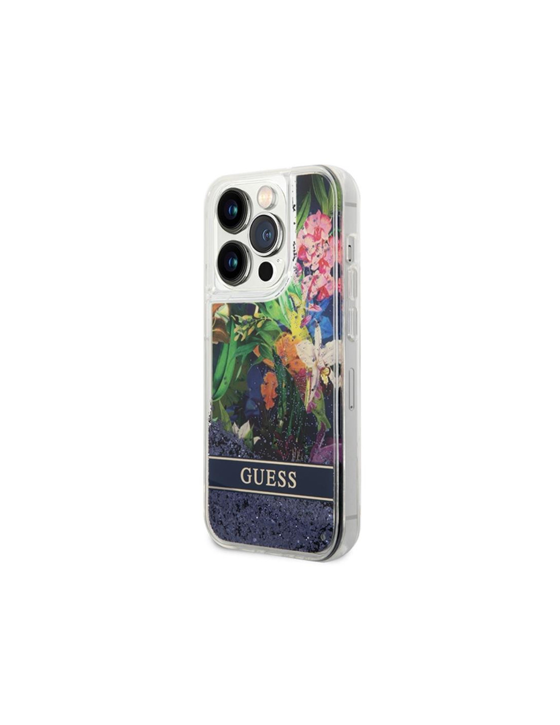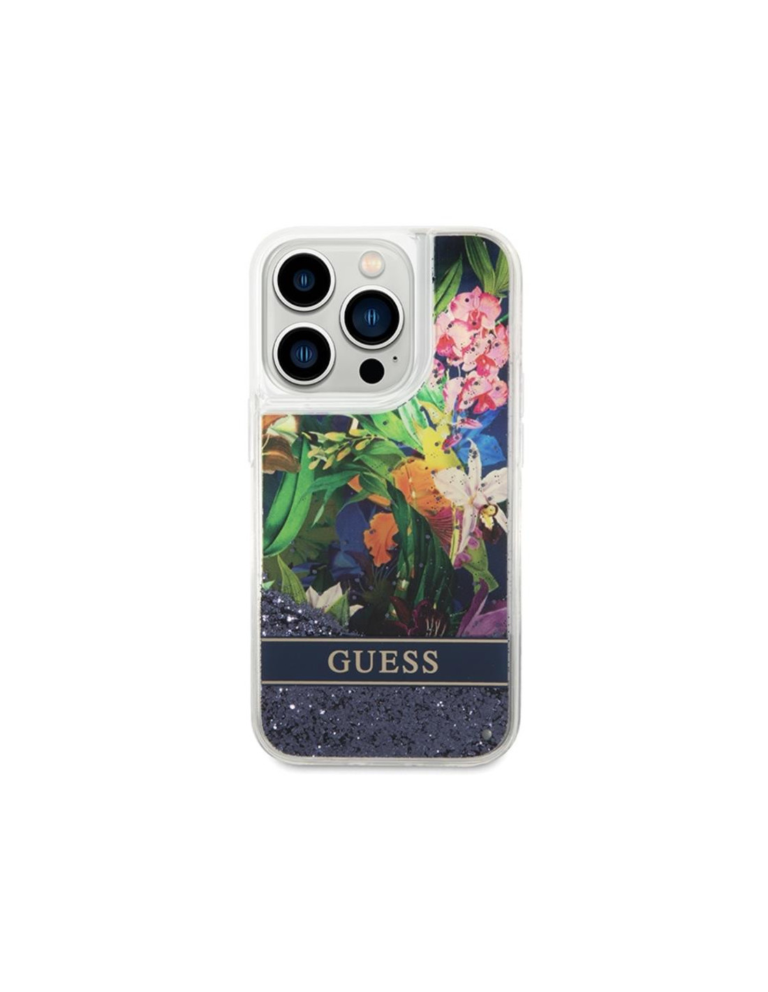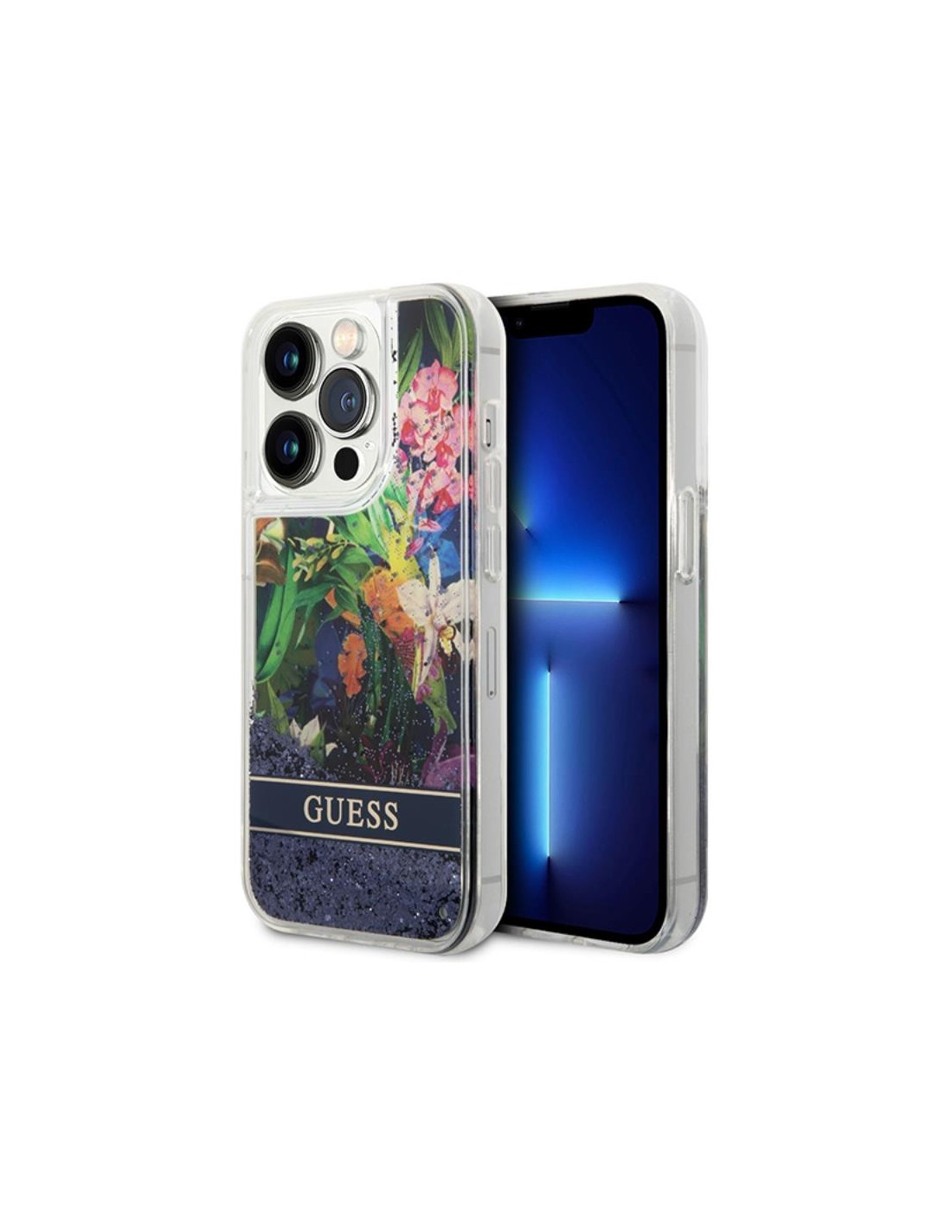 Etui Do iPhone 14 Pro Max Guess Liquid Glitter Flower Niebieski