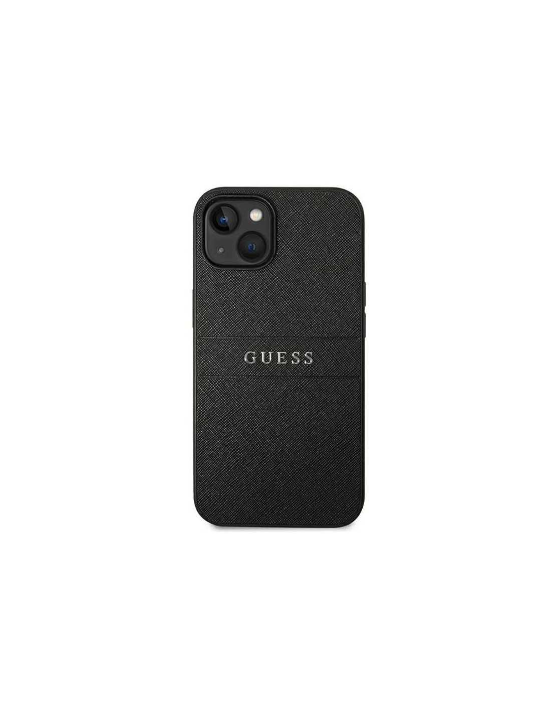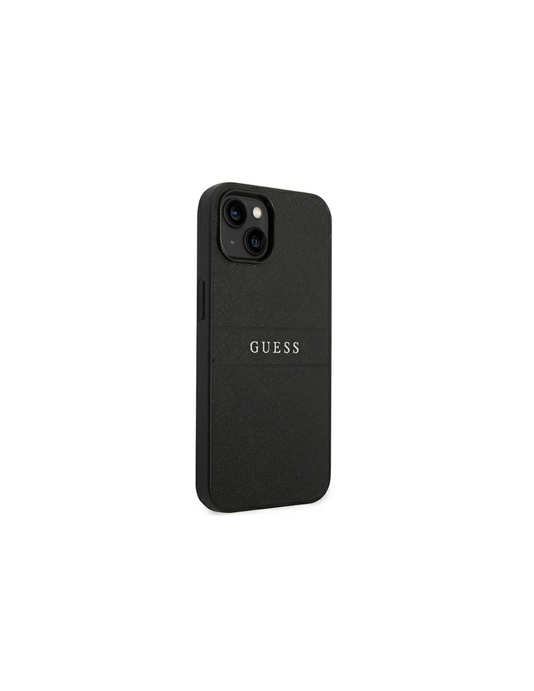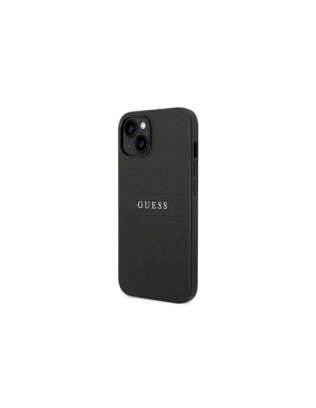 Guess Saffiano Metal Logo Stripes etui wykonane z eleganckiej i przyjemnej w dotyku skóry ekologicznej, o fakturze saffiano. Na środku znajduje się duże, metalowe logo Guess.