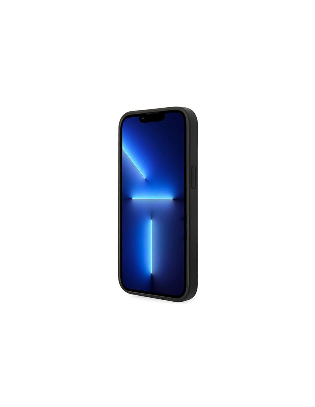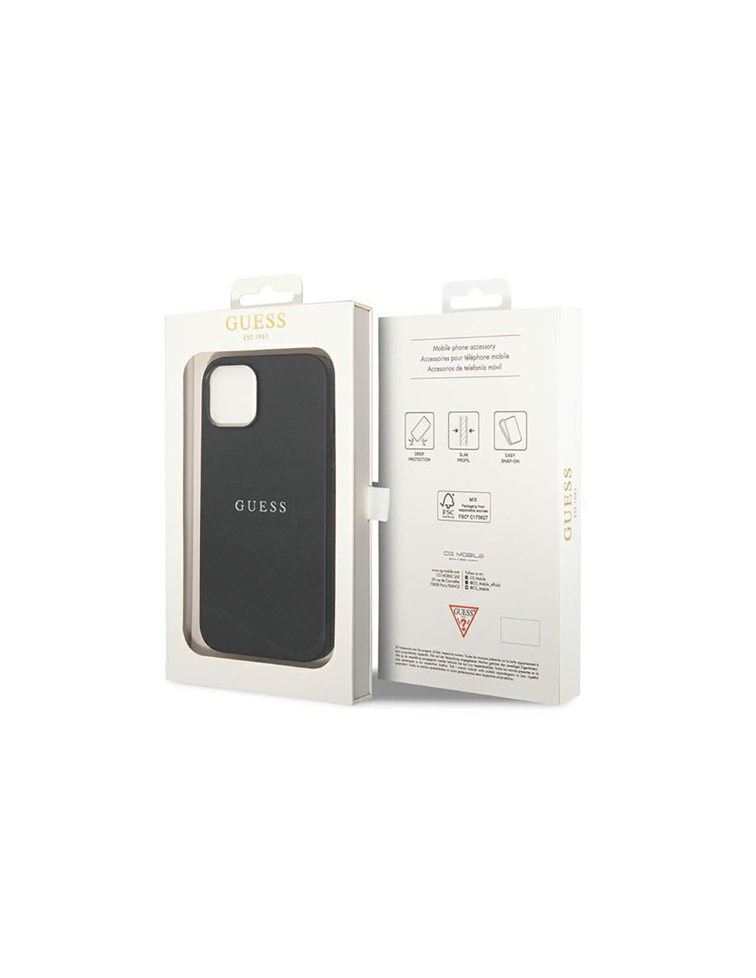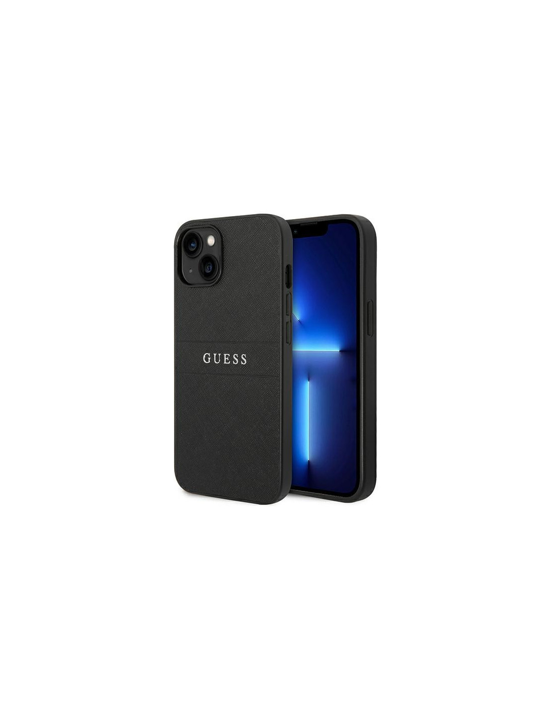 Guess Saffiano Metal Logo Stripes etui wykonane z eleganckiej i przyjemnej w dotyku skóry ekologicznej, o fakturze saffiano. Na środku znajduje się duże, metalowe logo Guess.