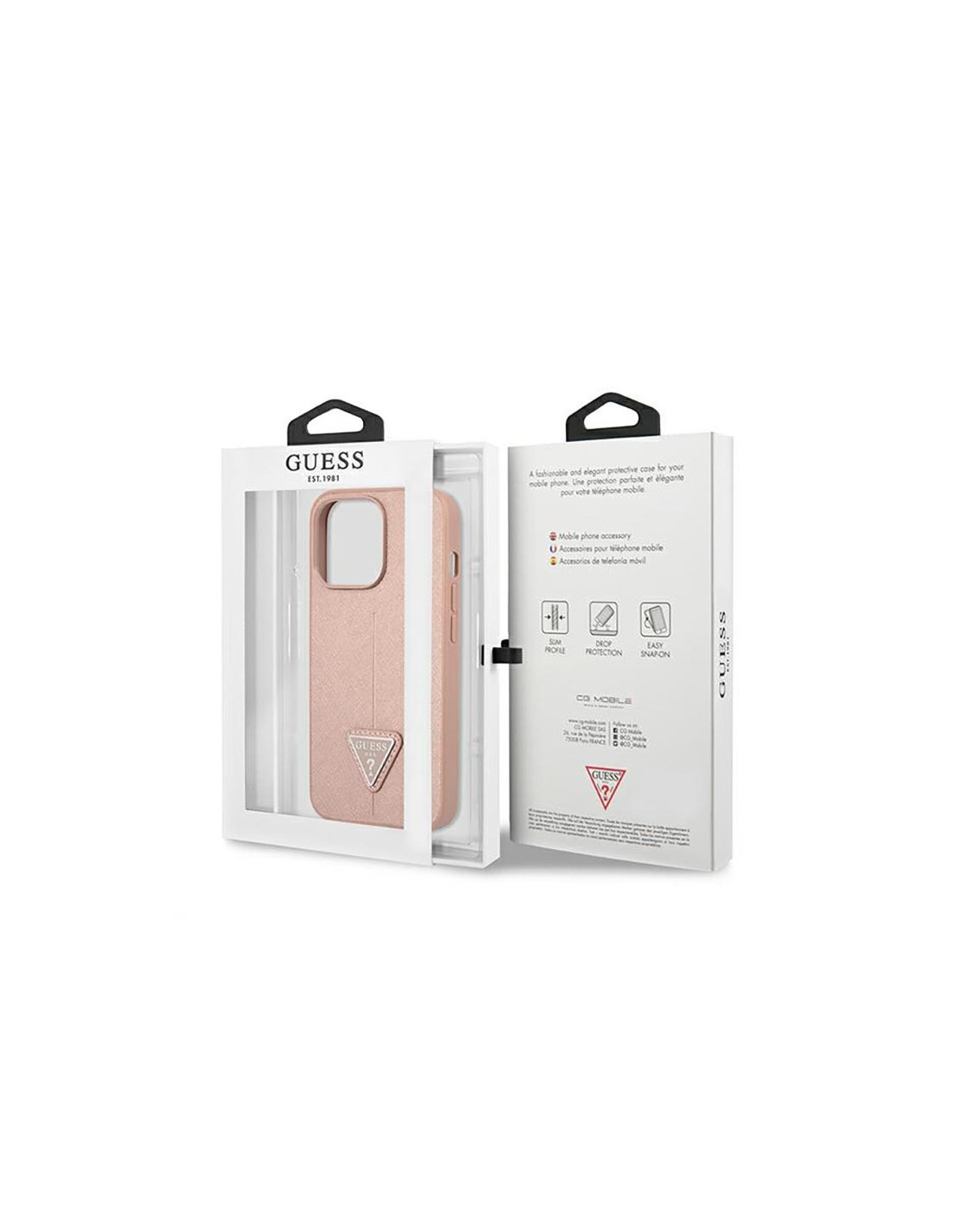 Guess Saffiano Triangle Logo etui wykonane z przyjemnej w dotyku fakturze ze skóry ekologicznej saffiano. Elegancki design podkreśla metalowe, trójkątne logo Guess.