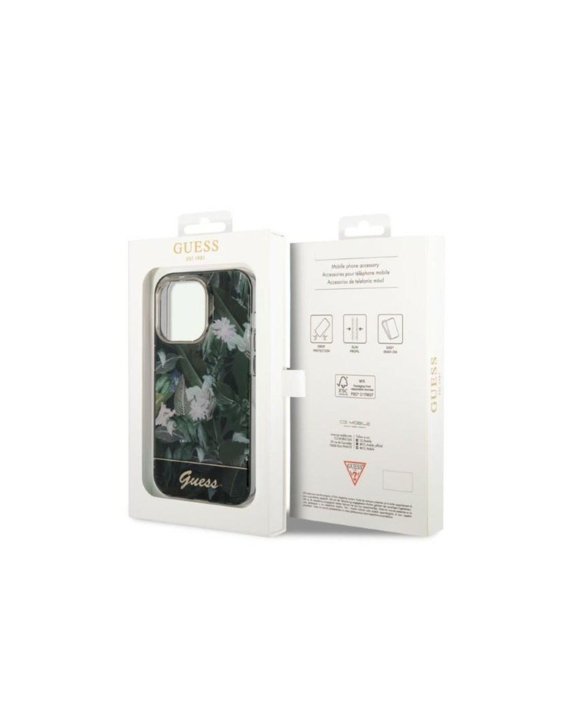 Guess Jungle Case to etui przeznaczono do ochrony przed porysowaniem urządzenia. Wykonane z wytrzymałego TPU i poliwęglanu. Smartfon bezpiecznie spoczywa w perfekcyjnie wykonanej konstrukcji, która osłania go z tyłu oraz po bokach w żaden sposób nie psując estetyki urządzenia. Etui oferuje efektowny design ze stylowym wzorem, wykończony złotym logiem Guess w stylu vintage.