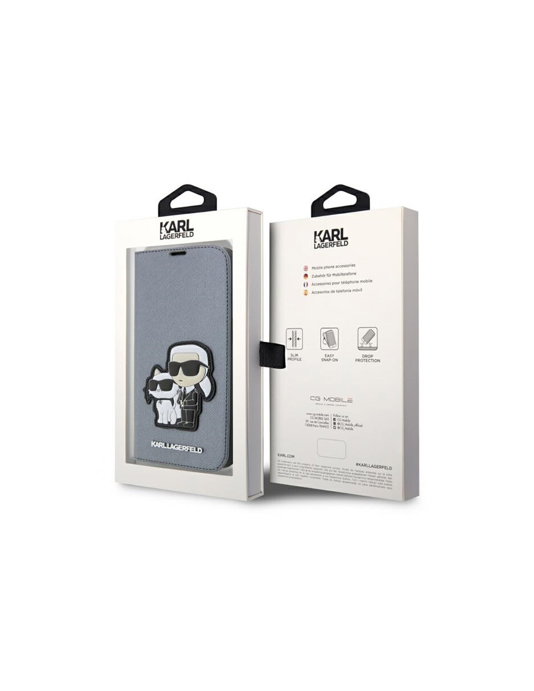 Karl Lagerfeld Booktype NFT Saffiano Karl & Choupette to etui, którego konstrukcja została wykonana z elastycznej, przyjemnej w dotyku skóry ekologicznej Saffiano, ozdobiona naszywką z wizerunkiem projektanta i jego ukochanej kotki Choupette.