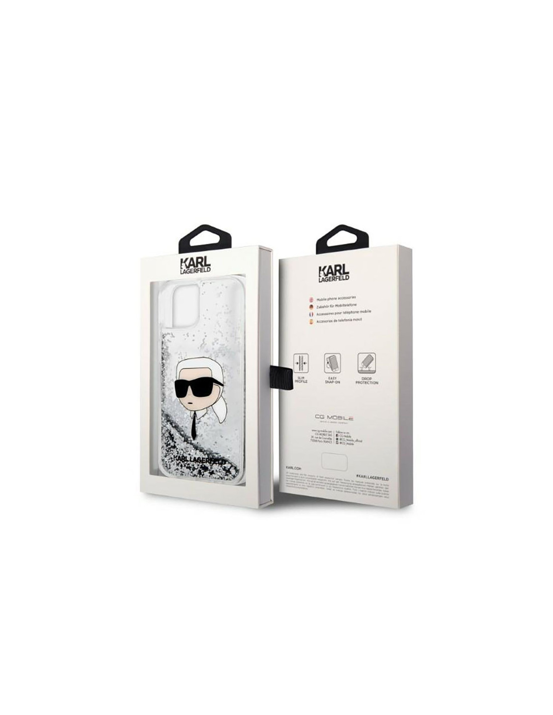 Aby nadać niesamowitego efektu, konstrukcja została ozdobiona postacią Karla Lagerfelda, podkreśloną przez płynne, mieniące się w świetle drobinki brokatu, które zmieniają swoje ułożenie pod wpływem zmiany kąta nachylenia etui, tworząc efekt wodospadu.