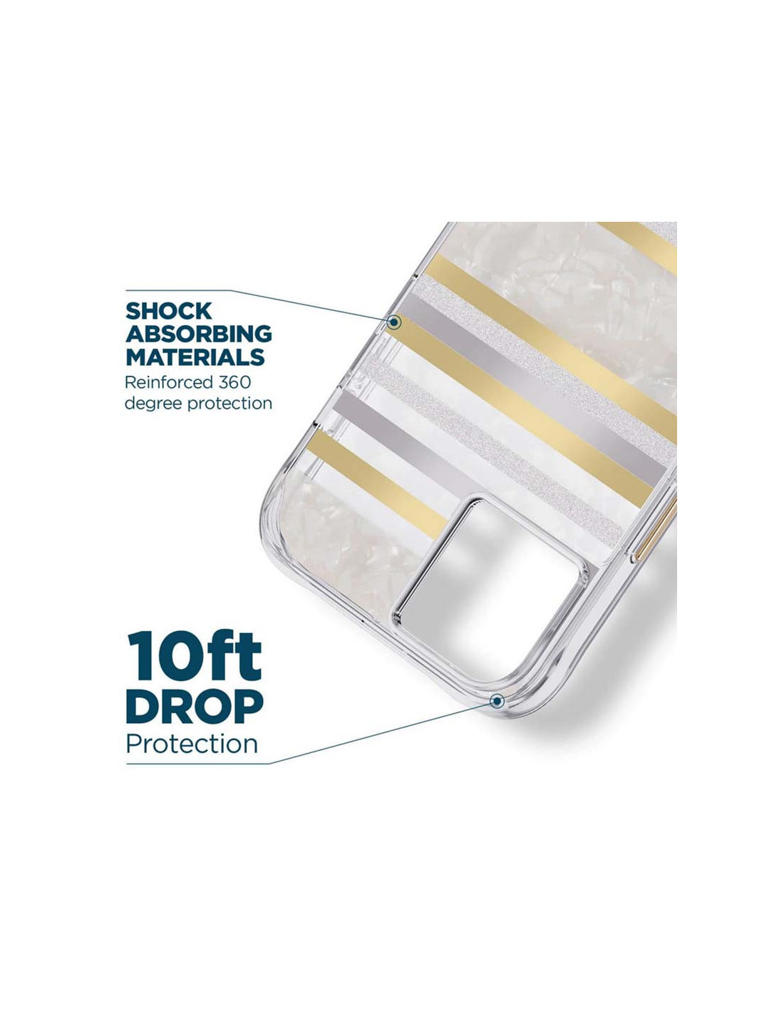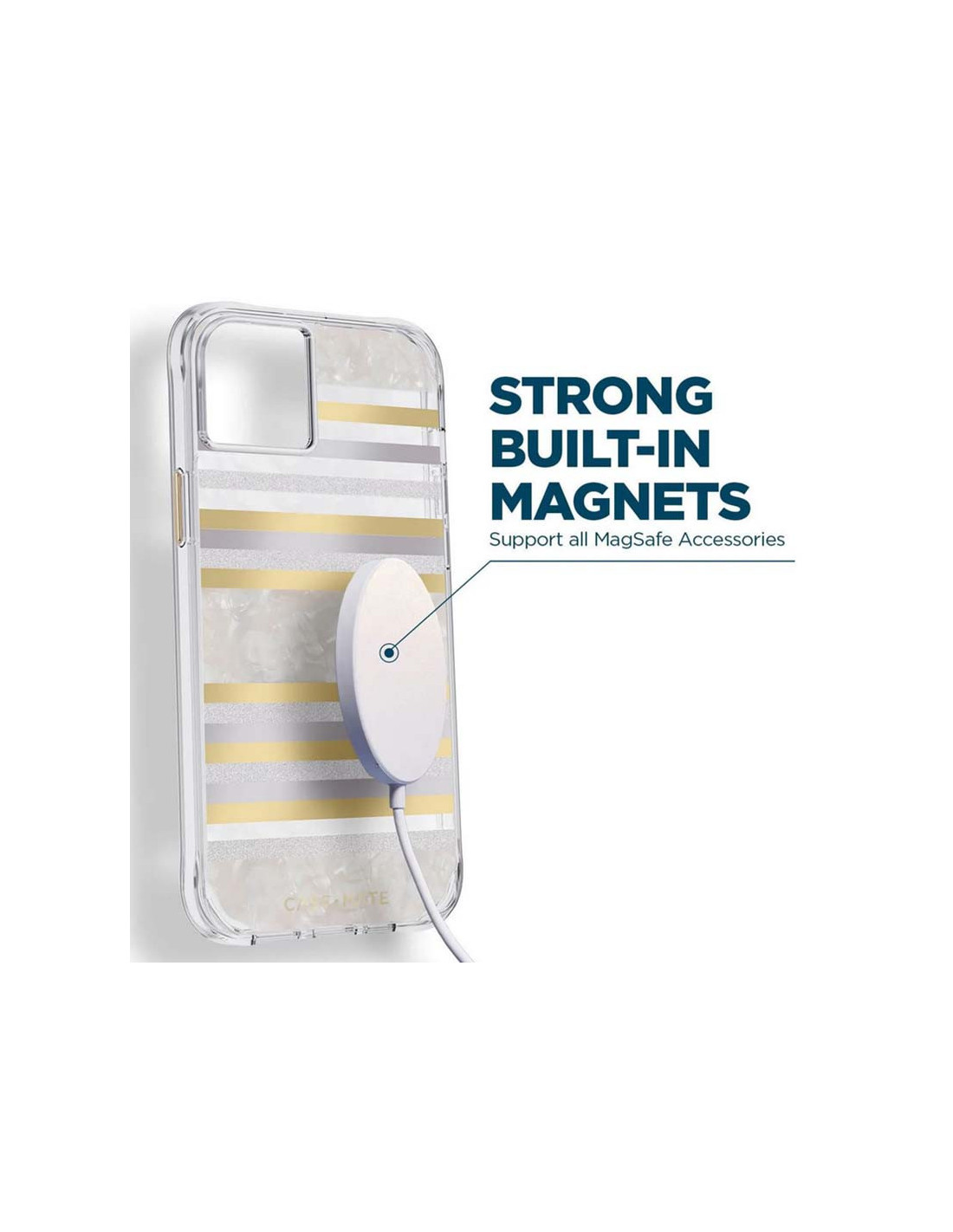 Smukłe i eleganckie etui ochronne do iPhone’a 14 Plus zdobione prawdziwą masą perłową oraz metalicznymi srebrnymi i złotymi paskami. Wbudowane magnesy sprawiają, że ładowarka MagSafe dopasowuje się za każdym razem precyzyjnie. Powierzchnia etui została ponadto zabezpieczona przed bakteriami, dzięki czemu pozostaje ono cały czas czyste, nie żółknie i jest przyjemne w użytkowaniu.