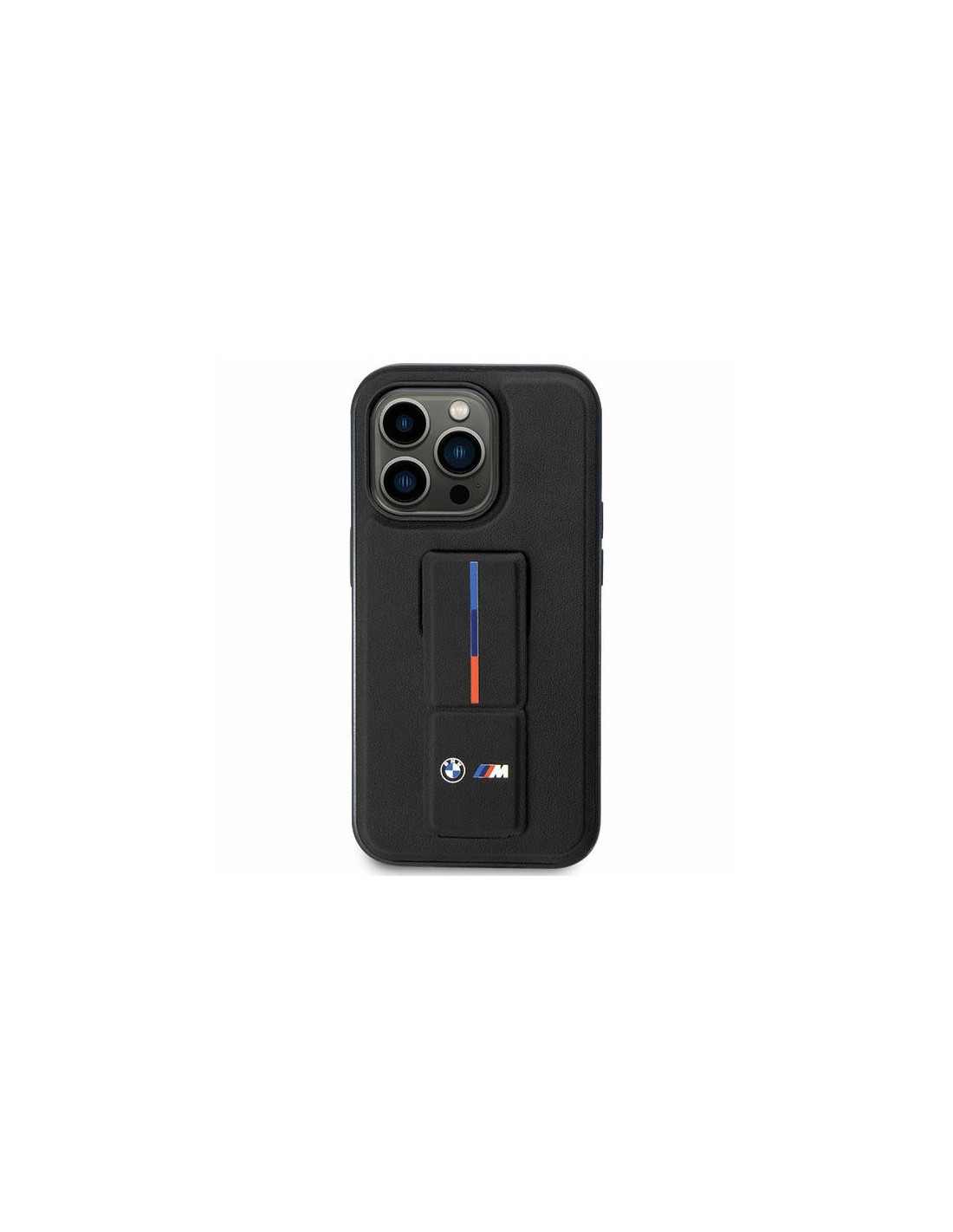 Etui BMW serii Grip Stand Hot Stamp wykonane zostało z połączenia poliwęglanu i eco skóry a krawędzie z elastycznego TPU, który zapewnia łatwy montaż. Futerał został ozdobiony wąskim paskiem w kolorystyce pakietu stylistycznego M Performance. Uzupełnieniem projektu jest emblemat pakietu M oraz logo BMW.