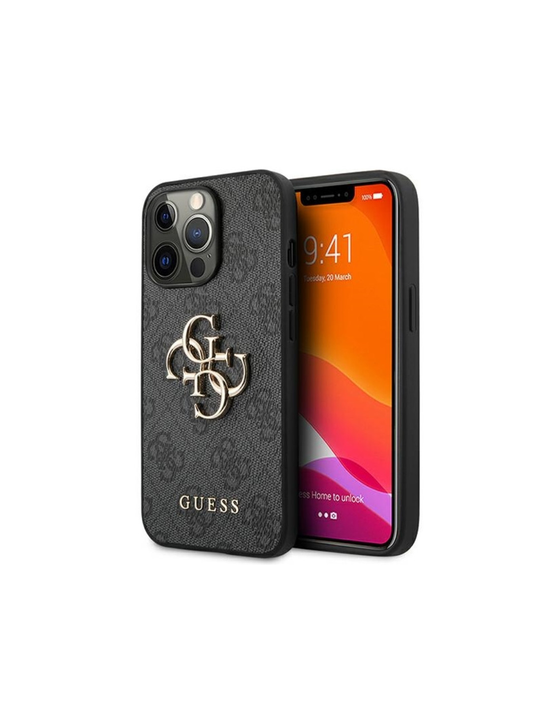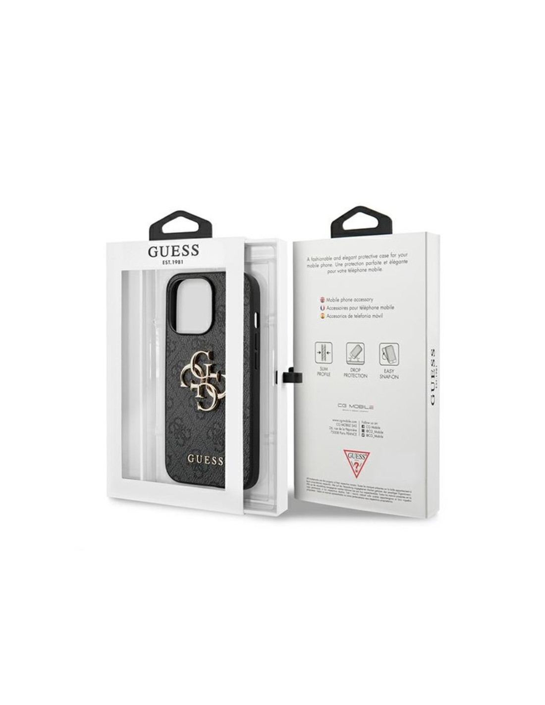 Duże, złote logo Guess 4G na środku etui i dodatkowe mniejsze na dole. Połączenie tych elementów sprawia, że całość prezentuje się bardzo elegancko.