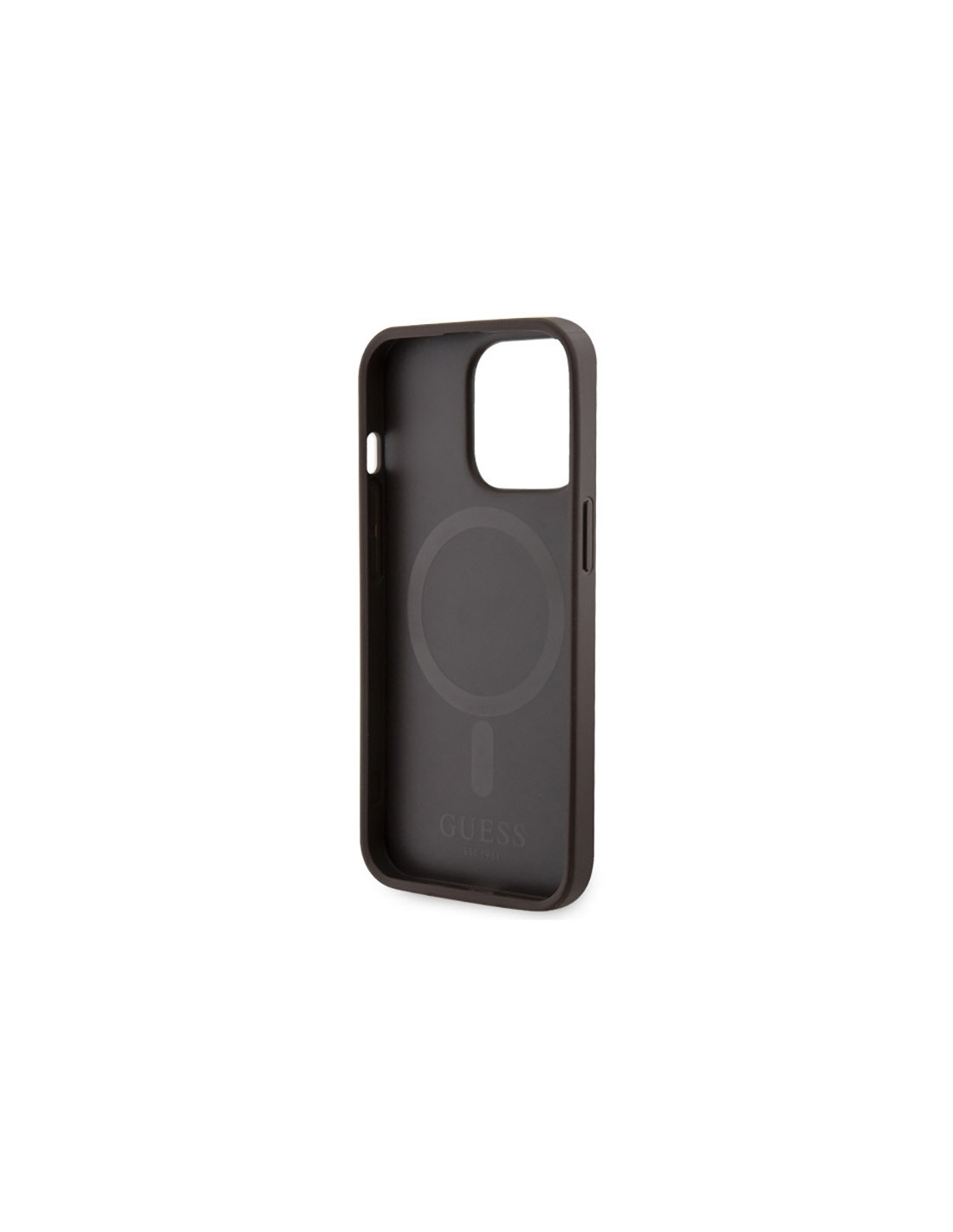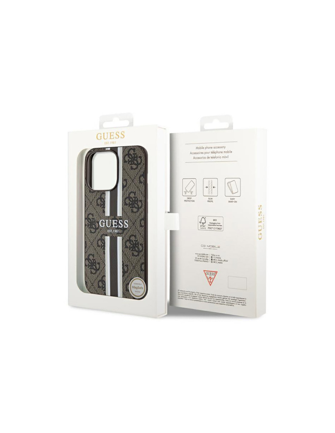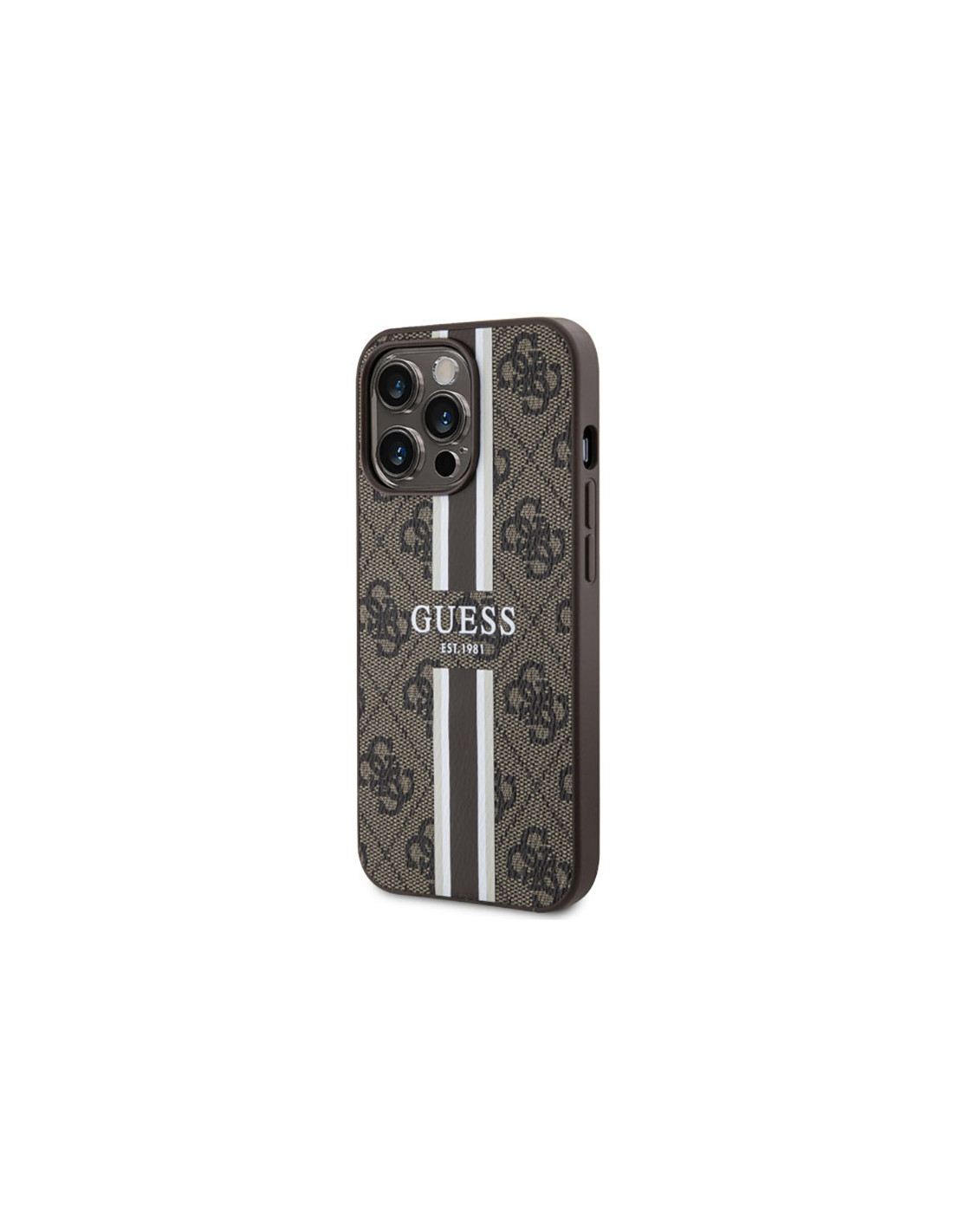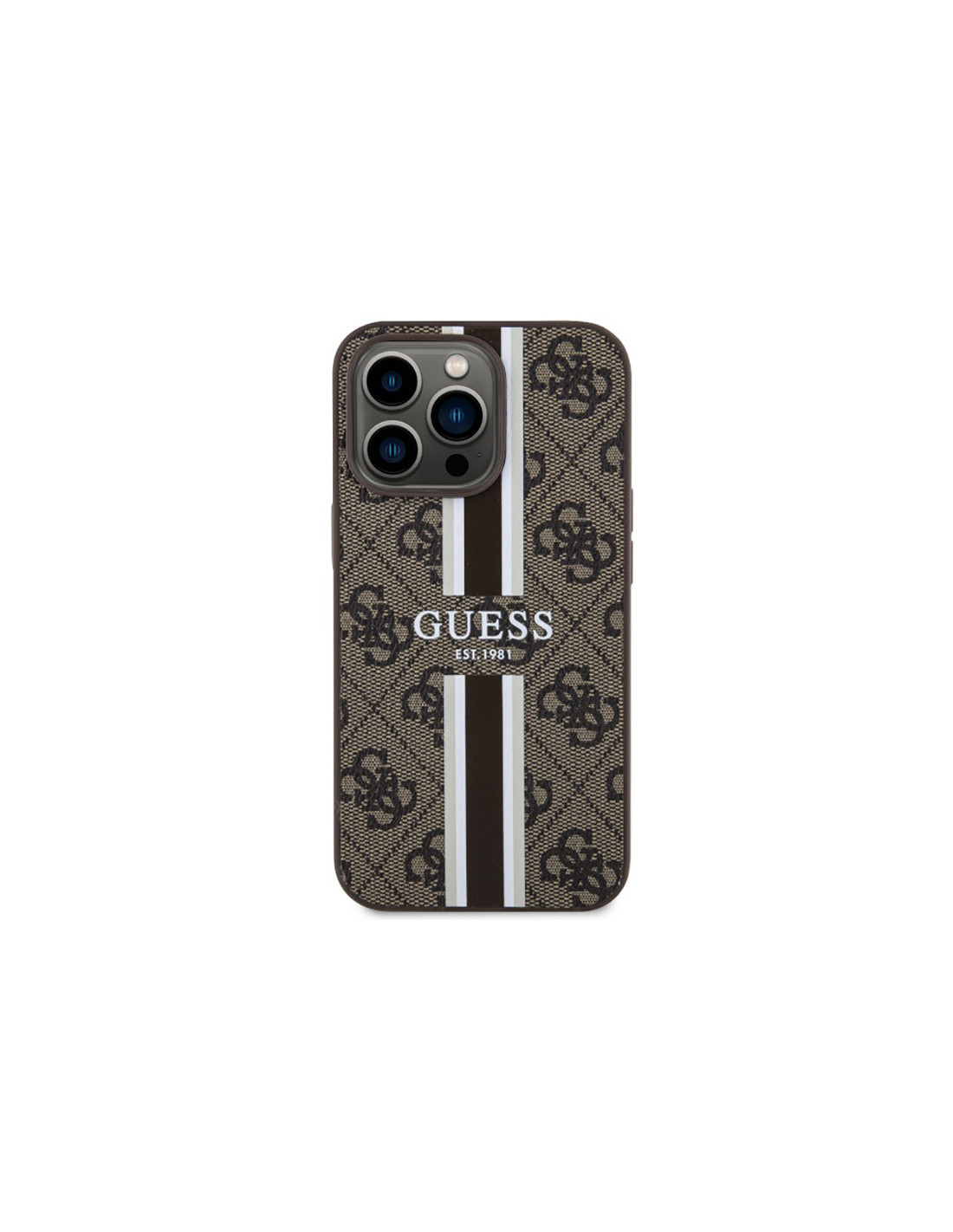 Guess 4G Printed Stripes MagSafe charakteryzuje się jednym z bardziej znanych motywów używanych przez Guess. Cały tylny panel etui pokryto emblematami 4G, które umiejscowiono na bardzo przyjemnej w dotyku fakturze saffiano oraz nadrukowane logo Guess umieszczone na wyróżniającym się pasku w kolorze etui.