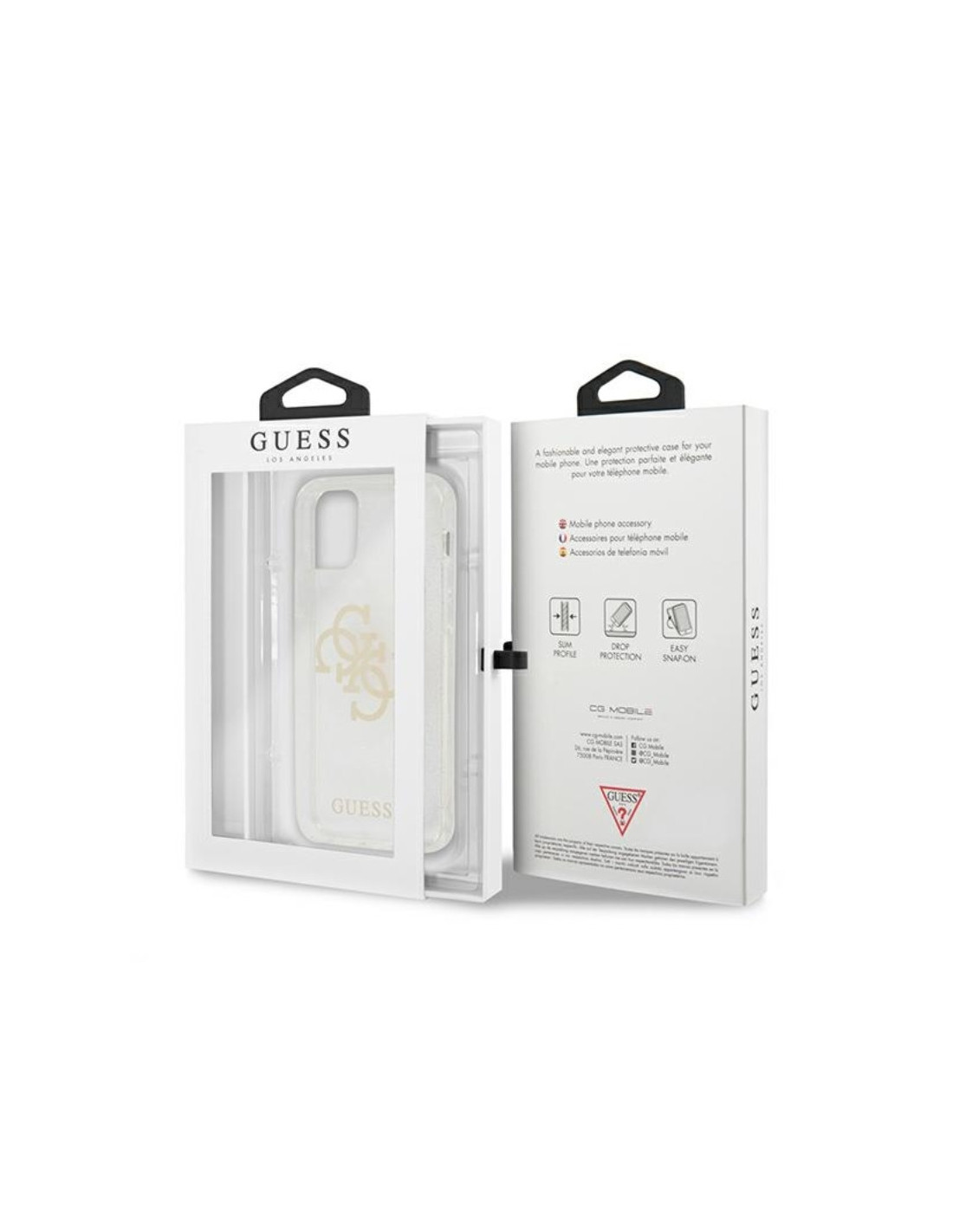 Na środku etui umieszczono duże, logo Guess 4G a na dole mniejsze, oba w kolorze złotym. Dodatkowo aby nadać niesamowitego efektu, cała konstrukcja ozdobiona została lśniącym brokatem.