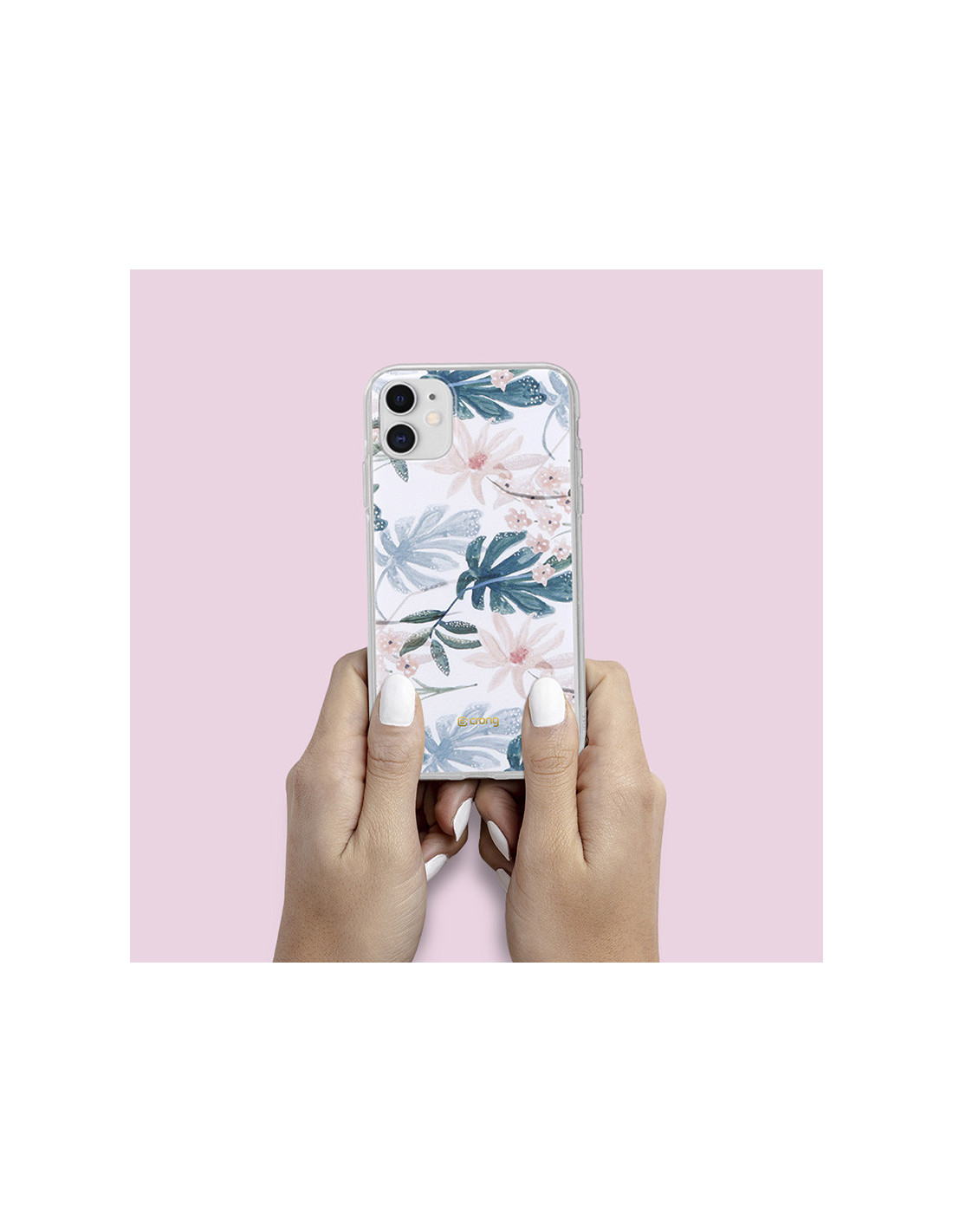 Flower Case firmy Crong dla iPhone 11 to modne i eleganckie etui ochronne z kwiatowymi motywami na pleckach. Atrakcyjny nadruk z dyskretnym logo w złotym kolorze zdobi cały tył telefonu. Elastyczny materiał dopasowuje się do obudowy i zabezpiecza wszystkie krawędzie ekranu dotykowego. Specjalna struktura wewnątrz etui zapobiega przyklejaniu się etui do nagrzanej obudowy smartfona.