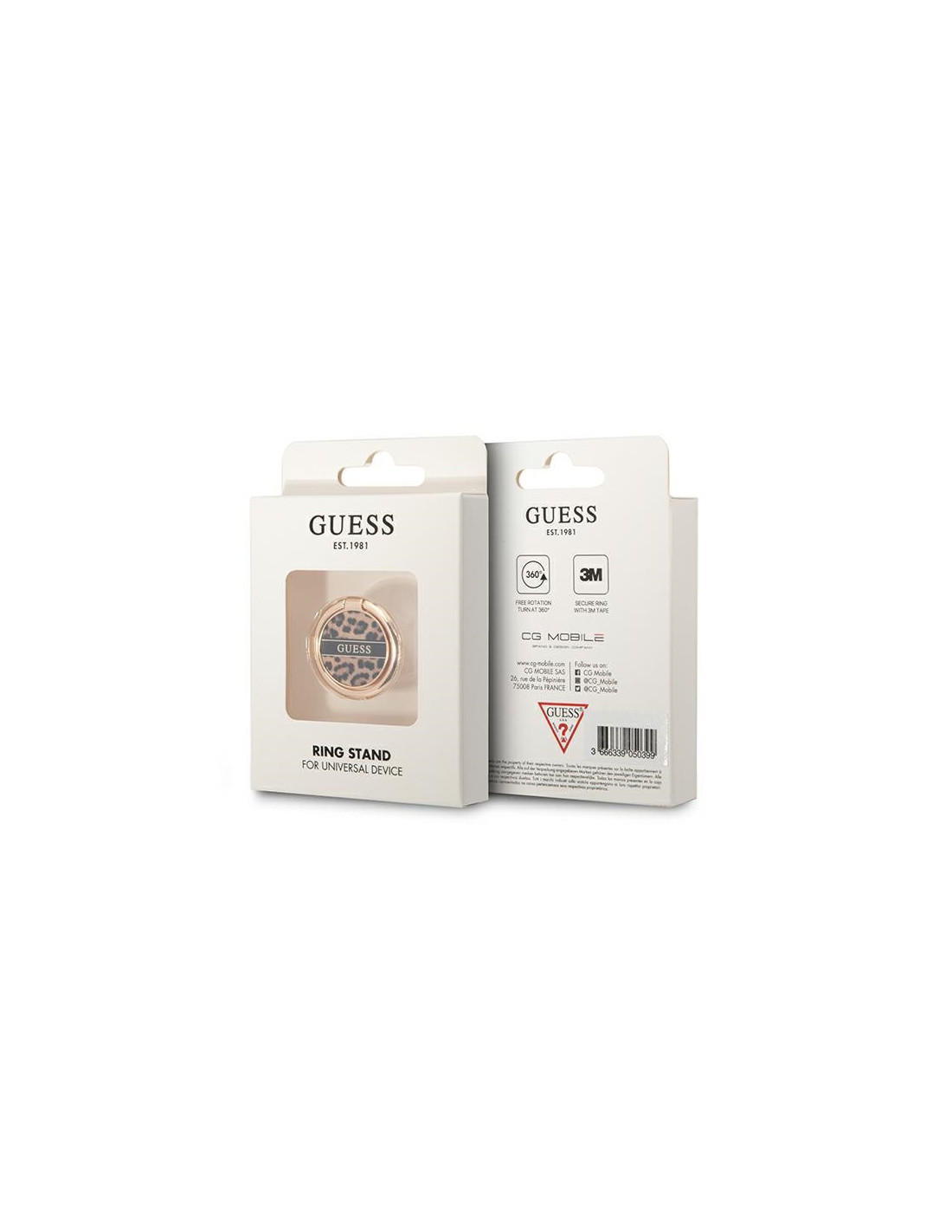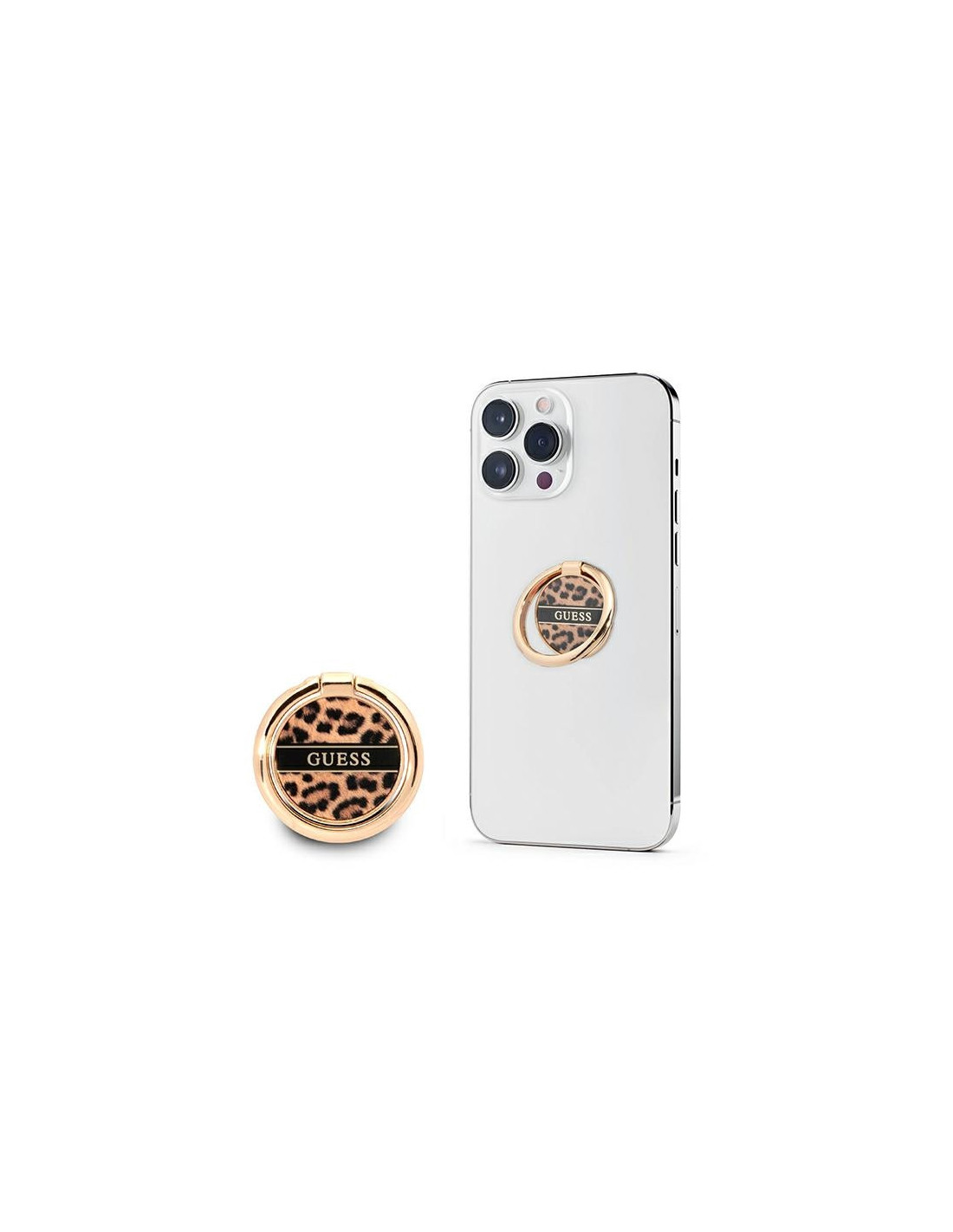 Lekki i kompaktowy uchwyt na palec do telefonu marki Guess, wykonany z metalu w kolorze złotym.