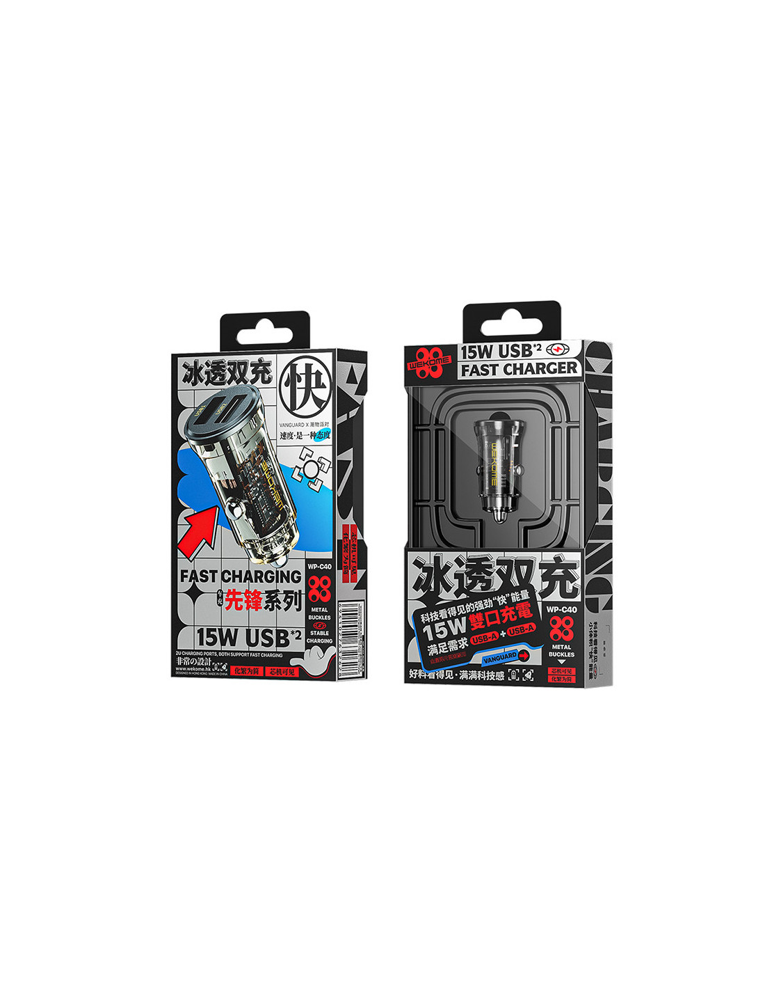 Ładowarka samochodowa WEKOME WP-C40 Vanguard Series posiada 2 porty USB-A, co pozwala na jednoczesne uzupełnianie energii w dwóch urządzeniach.
