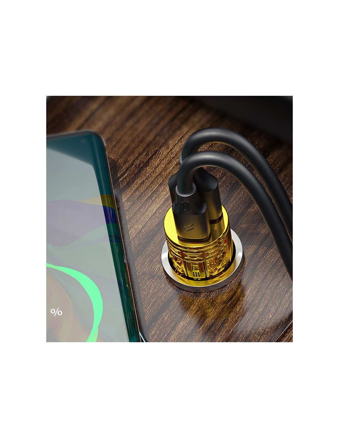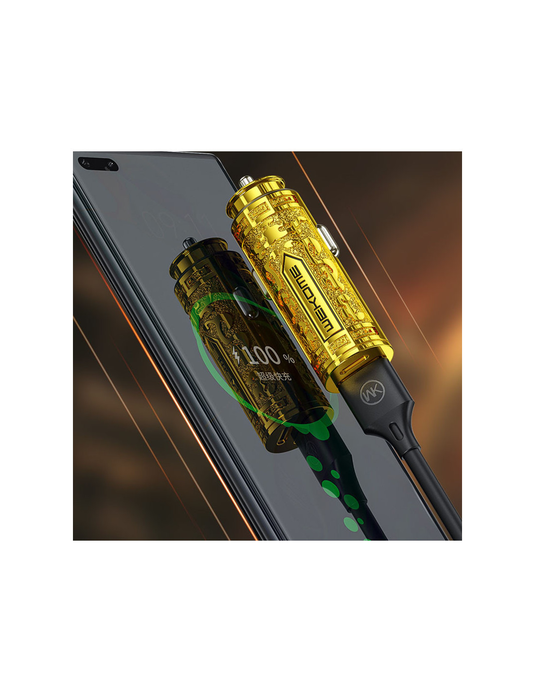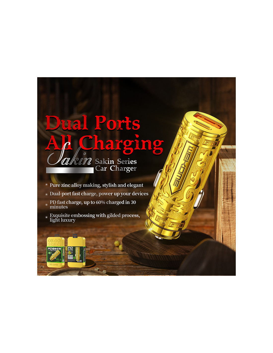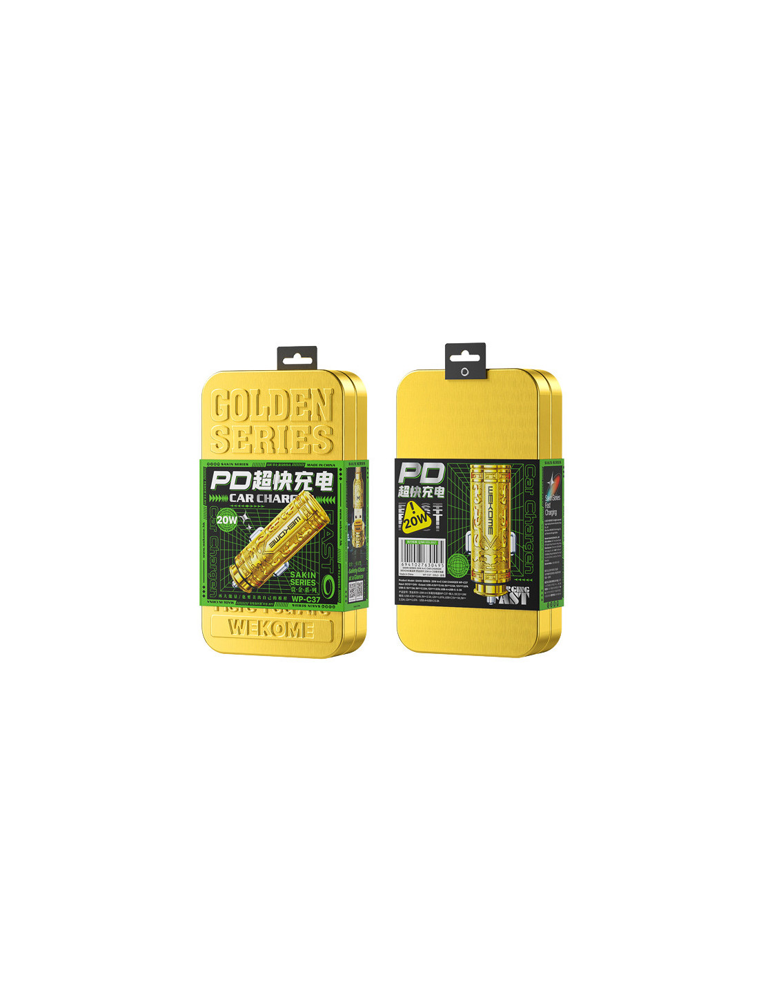 Ładowarka samochodowa WEKOME WP-C37 Sakin Series posiada port USB-A oraz USB-C, co pozwala na jednoczesne uzupełnianie energii w dwóch urządzeniach.